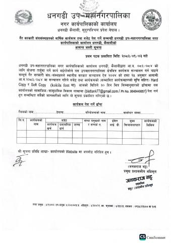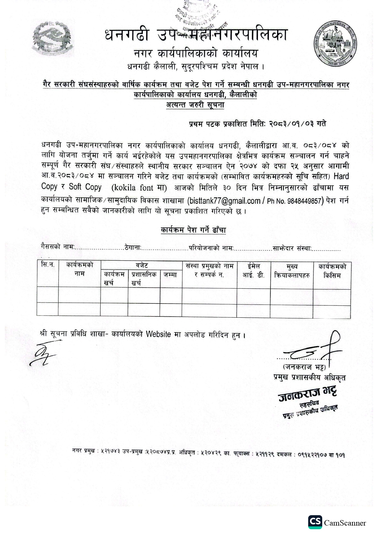 गैर सरकारी संघसंस्थाहरुको वार्षिक कार्यक्रम तथा बजेट पेश गर्ने सम्बन्धी धनगढी उप-महानगरपालिका नगर कार्यपालिकाको कार्यालय धनगढी, कैलालीको अत्यन्त जरुरी सूचना