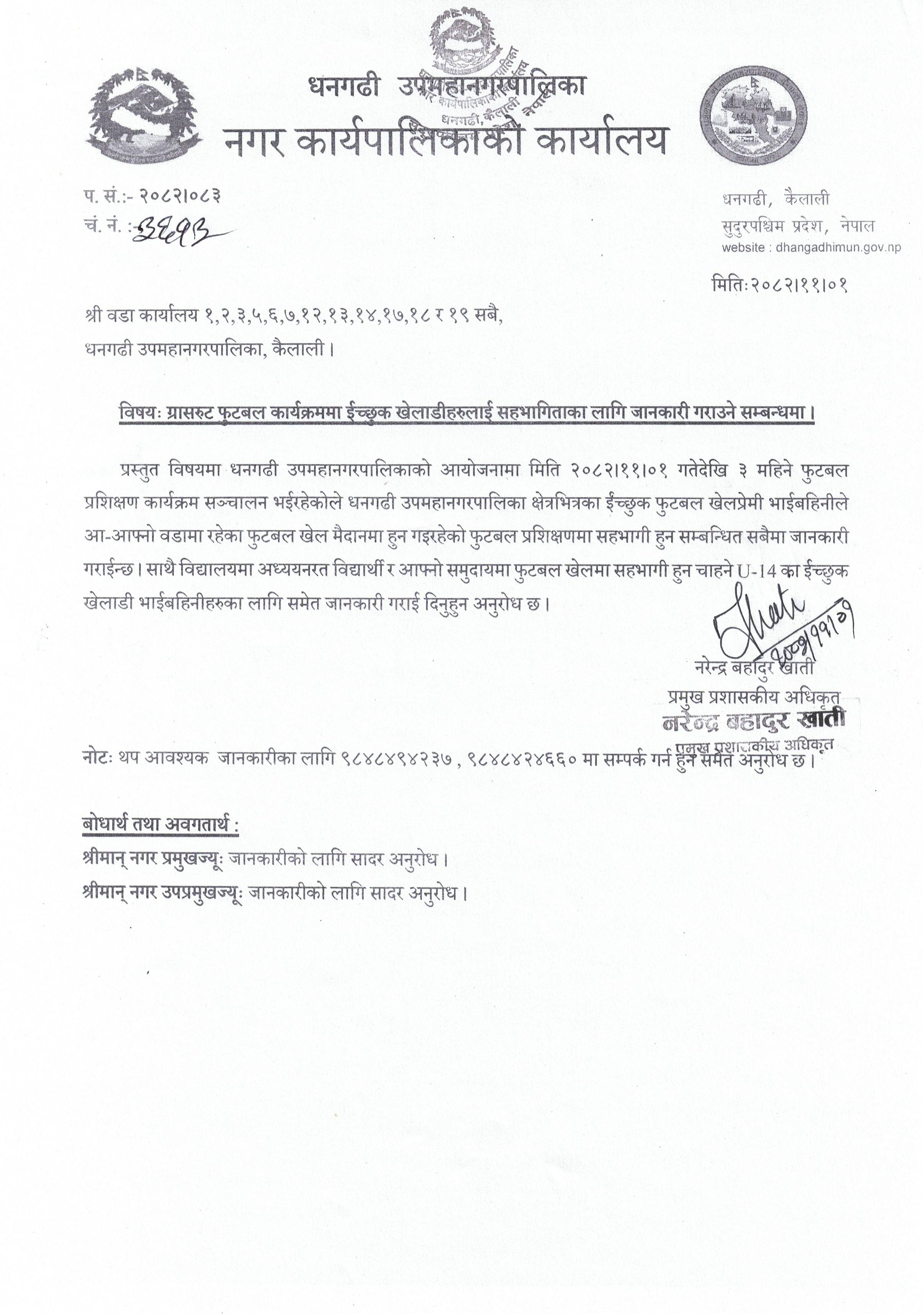 » ग्रासरुट फुटबल कार्यक्रममा इच्छुक खेलाडीहरुलाई सहभागिताका लागि जानकारी सम्बन्धमा ।