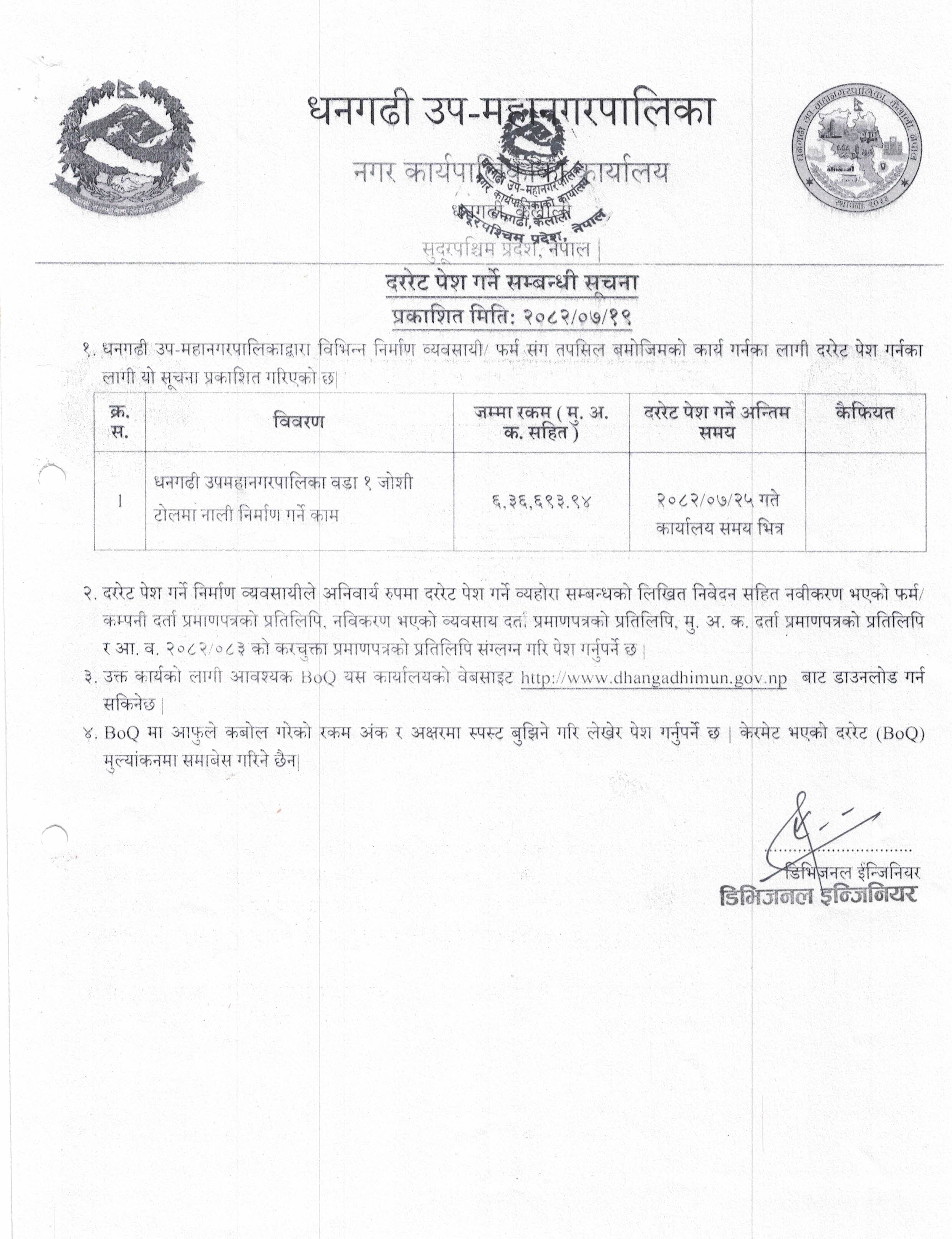 » दररेट पेश गर्ने सम्बन्धी सूचना [वडा नं १ जोशी टोलमा नाली निर्माण गर्ने काम]