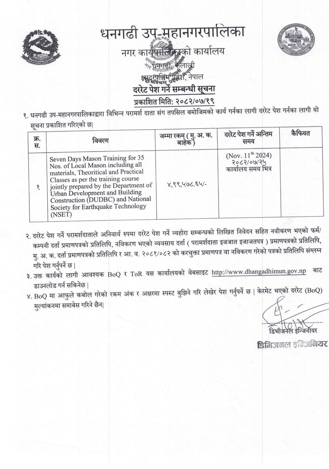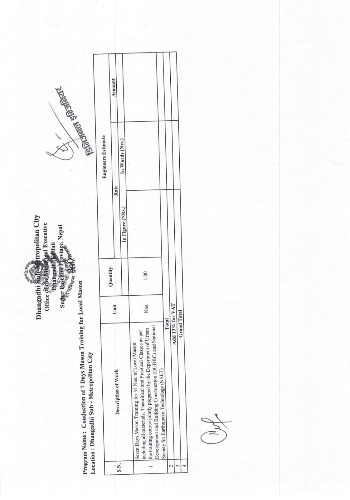 दररेट पेश गर्ने सम्बन्धी सूचना । [Seven Days Mason Training for 35 Nos. of Local Mason including all materials, theoritical and Practical Classes as per the training course jointly prepared by the Department of Urban Development and building Construction