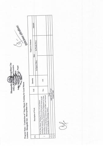 Home » दररेट पेश गर्ने सम्बन्धी सूचना । [Seven Days Mason Training for 35 Nos. of Local Mason including all materials, theoritical and Practical Classes as per the training course jointly prepared by the Department of Urban Development and building Construction