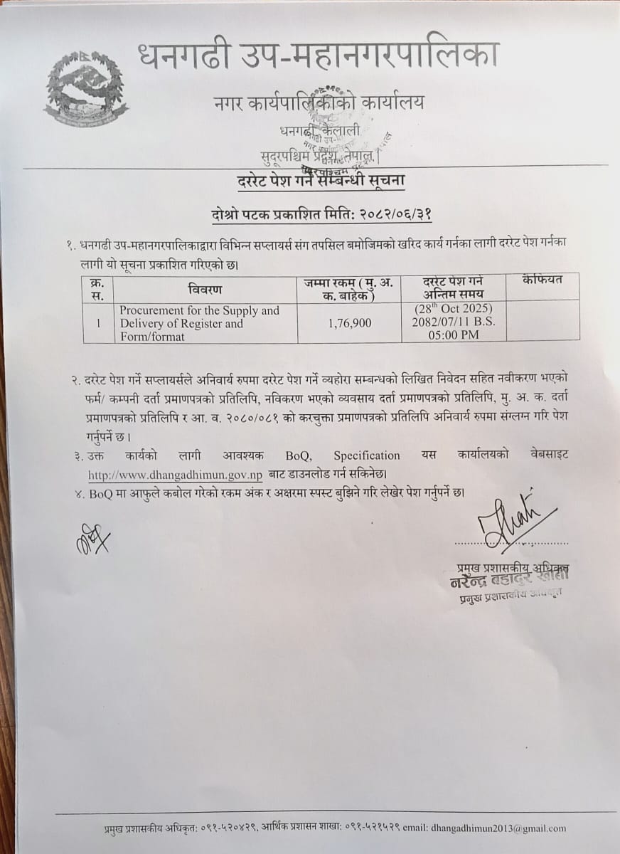 दररेट पेश गर्ने सम्बन्धी सूचना (Procurement for the Supply and Delivery of Register and Form/Format)