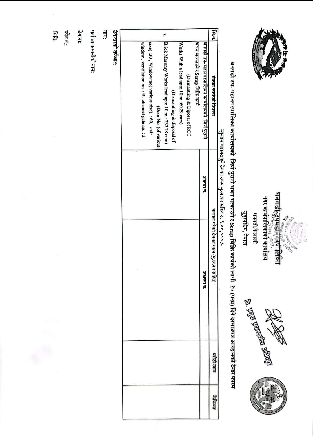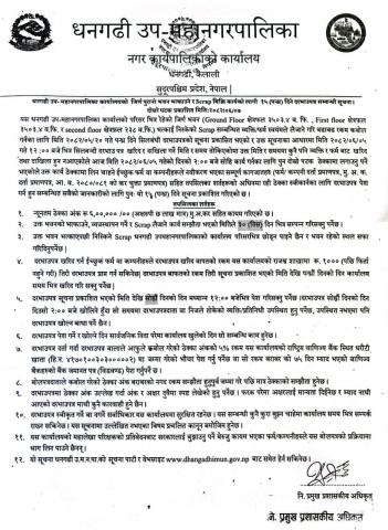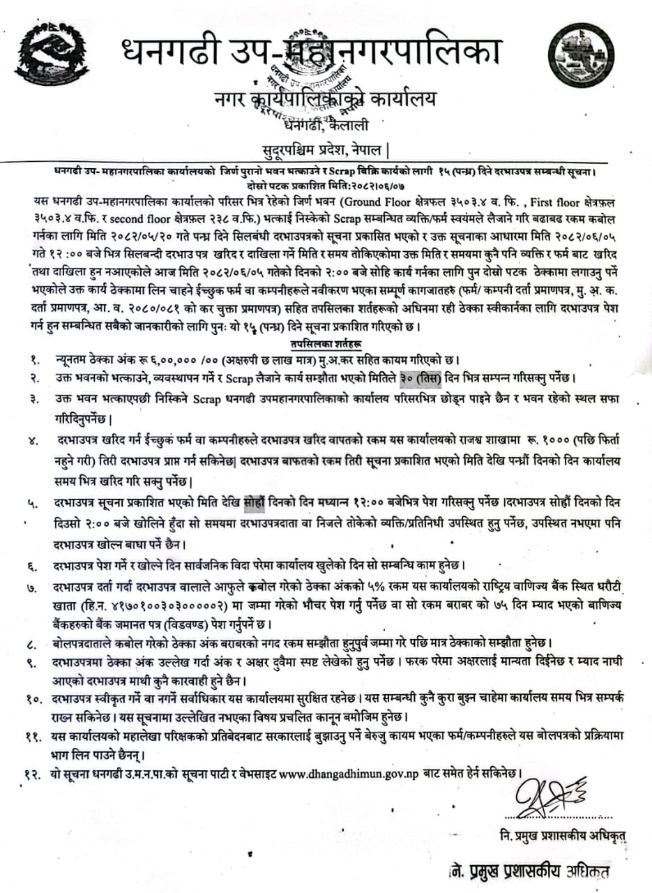 धनगढी उप-महानगरपालिका कार्यालयको जिर्ण पुरानो भवन भत्काउने र Scrap बिक्री कार्यको लागी ०७(सात) दिने दरभाउपत्र सम्बन्धी सूचना (दोस्रो पटक प्रकाशित)