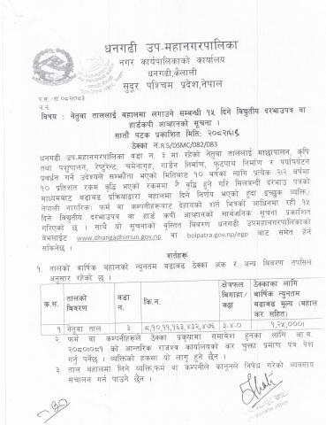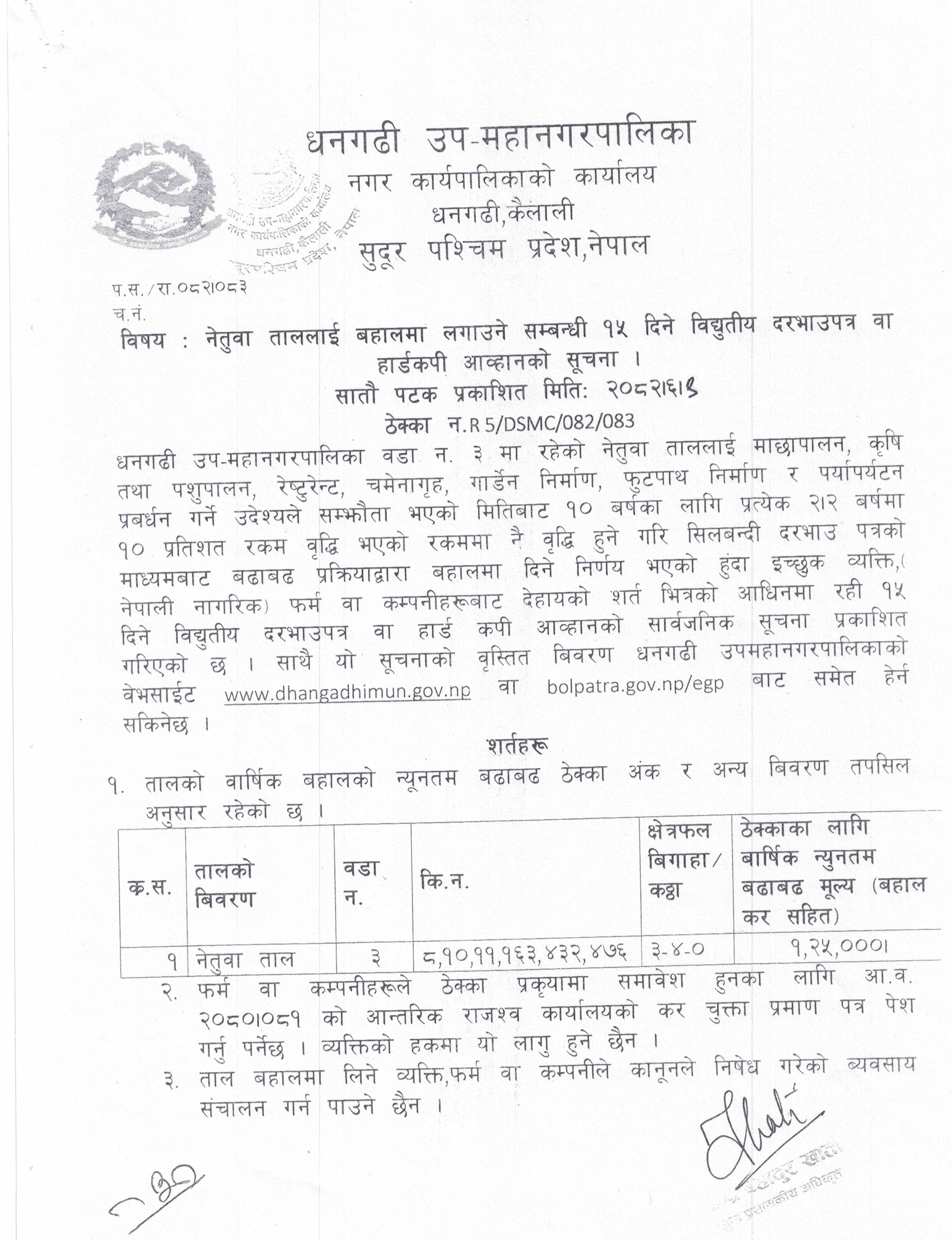 नेतुवा ताललाई बहालमा लगाउने सम्बन्धी १५ दिने विधुतीय दरभाउपत्र वा हार्डकपी आव्हानको सूचना [ठेक्का नं R5/DSMC/082/083]
