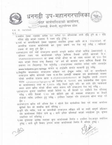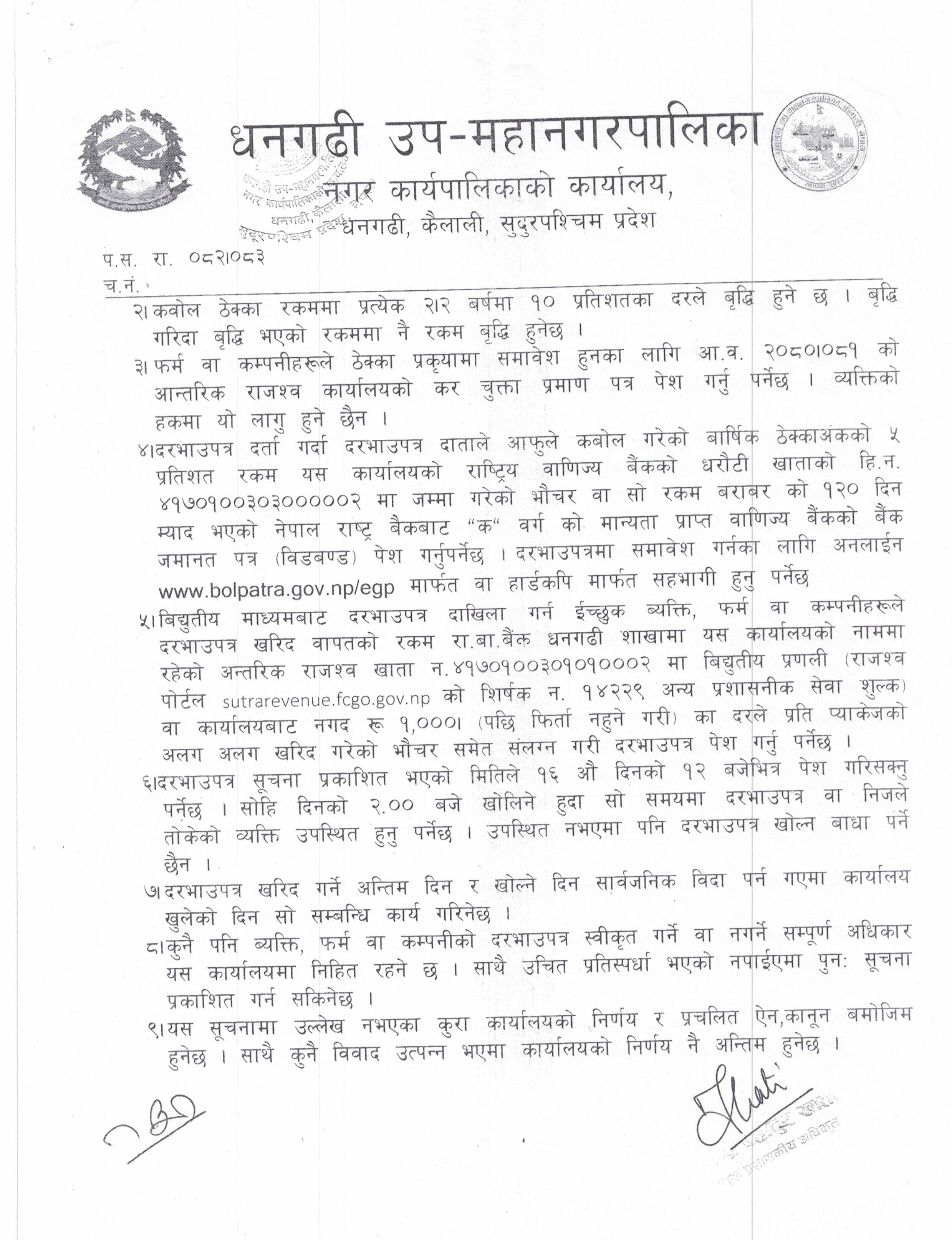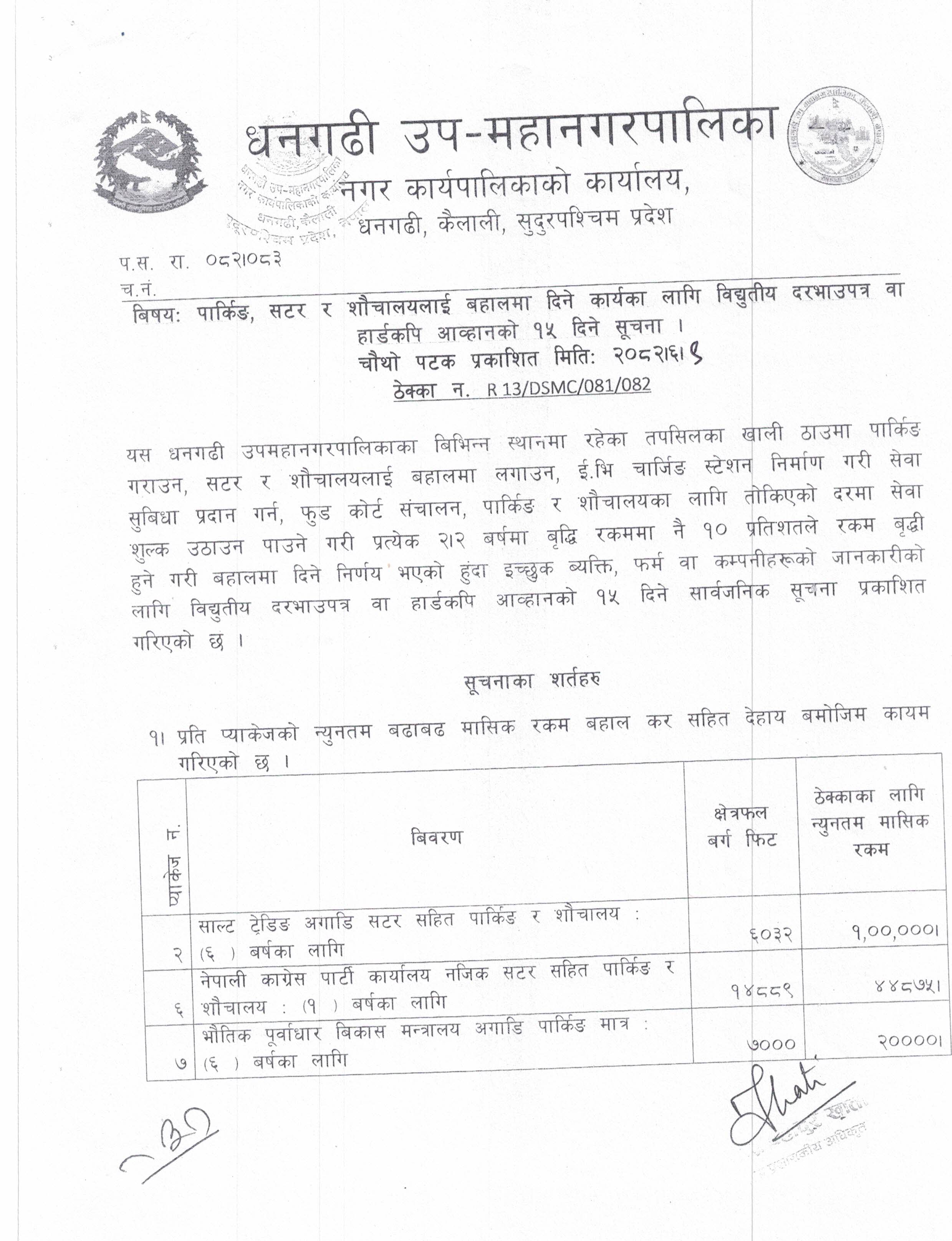 पार्किङ, सटर, र शौचालयलाई बहालमा दिने कार्यका लागि विधुतीय दरभाउ पत्रवा हार्डकपी आव्हानको १५ दिने सूचना [ठेक्का नं. R13/DSMC/081/082]