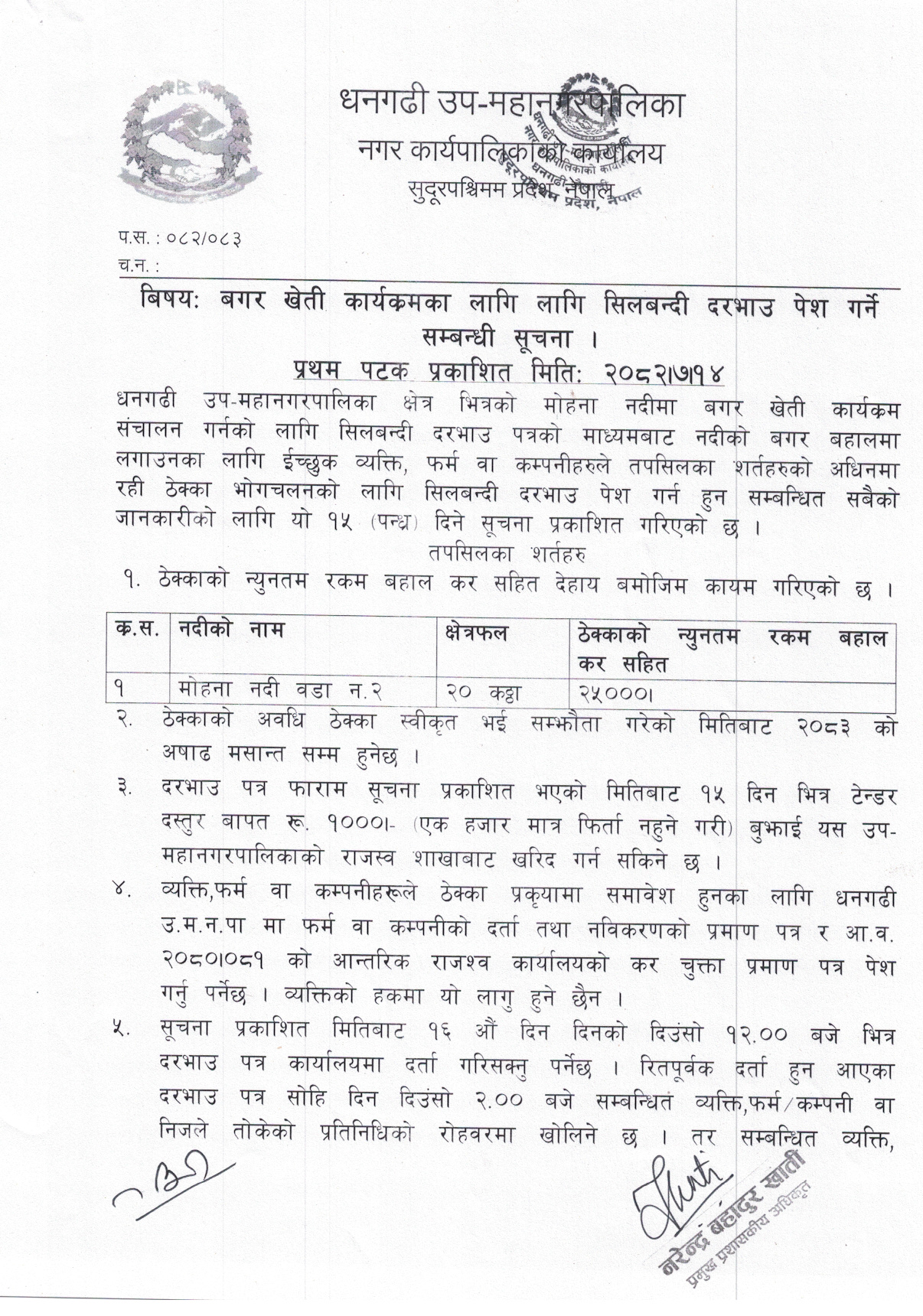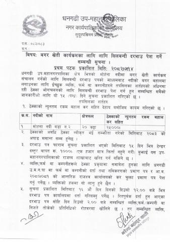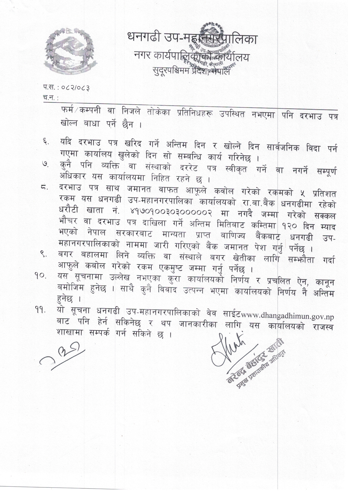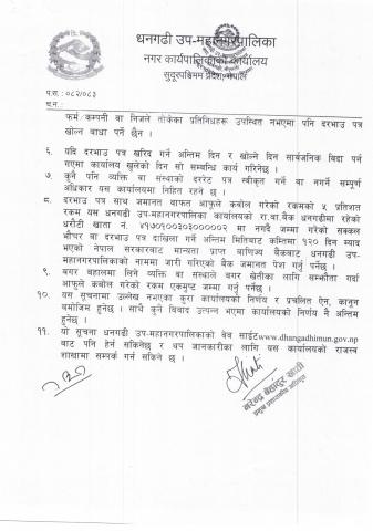 धनगढी उप-महानगरपालिका वडा नं ४ सुत्केरी तथा गर्भवती महिलाहरुलाई पोषणयुक्त खानेकुरा वितरण सम्बन्धीका लागि दररेट आव्हान सम्बन्धी दोश्रो पटक प्रकाशित सूचना