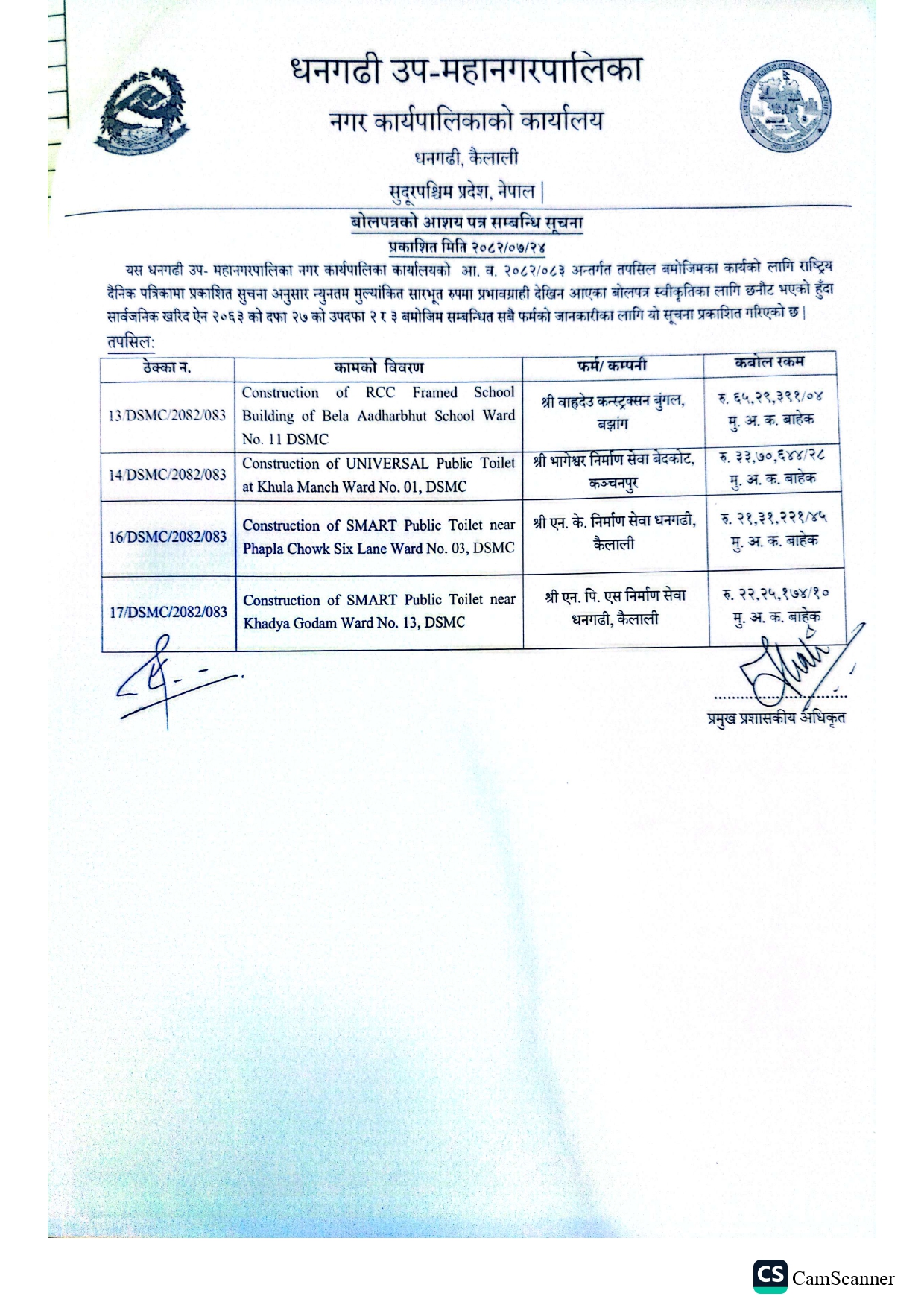 बोलपत्रको आशय पत्र सम्बन्धि सूचना [ठेक्का नं १३,१४,१६ ,१७]