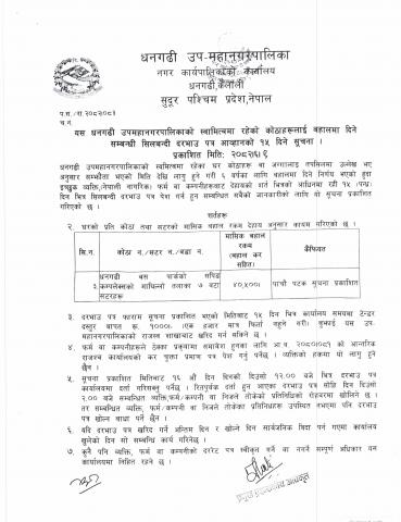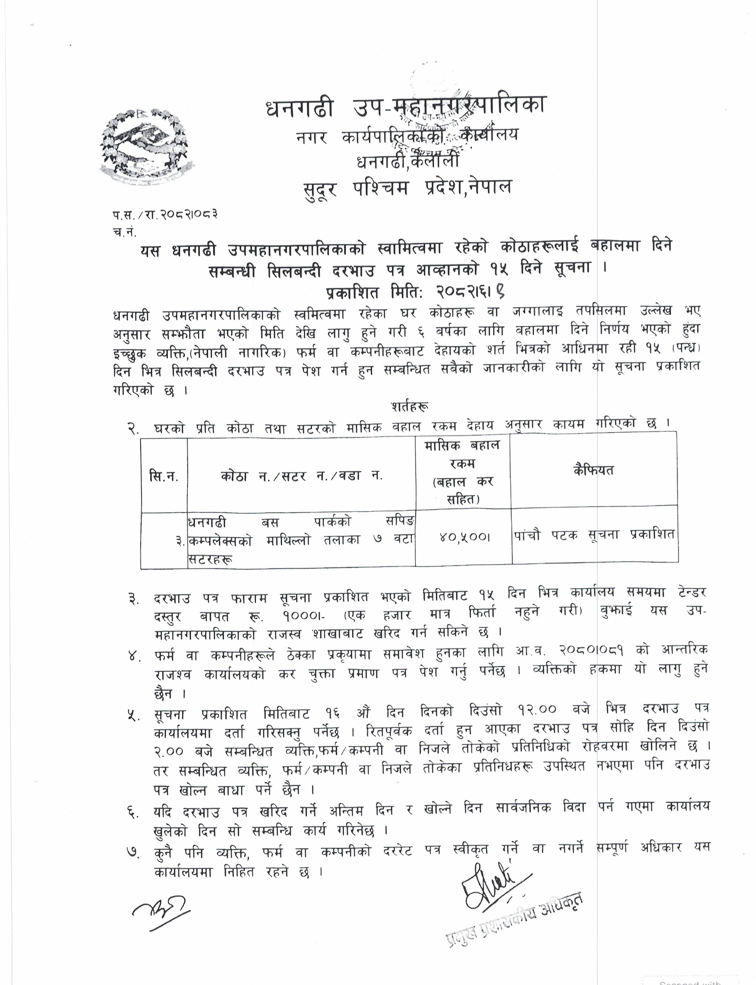 » यस धनगढी उपमहानगरपालिकाको स्वामित्वमा रहेको कोठाहरुलाई बहालमा दिने सम्बन्धी सिलबन्दी दरभाउ पत्र आव्हानको १५ दिने सूचना ।