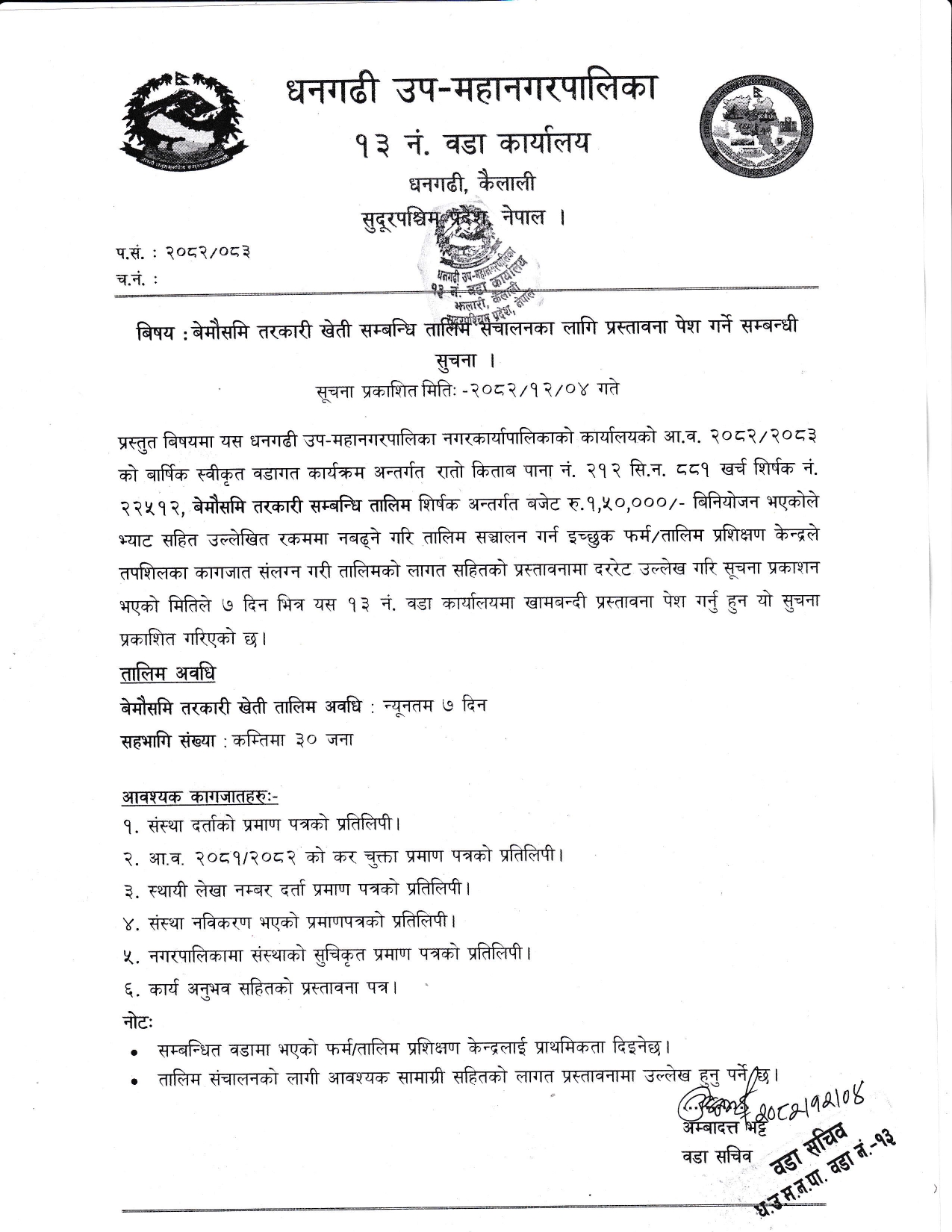 [वडा नं १३] बेमौसमि तरकारी खेती सम्बन्धी तालिम संचालनका लागि प्रस्तावना पेश गर्ने सम्बन्धी सूचना।