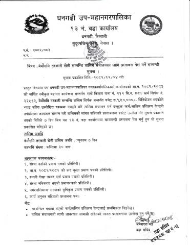 » [वडा नं १३] बेमौसमि तरकारी खेती सम्बन्धी तालिम संचालनका लागि प्रस्तावना पेश गर्ने सम्बन्धी सूचना।