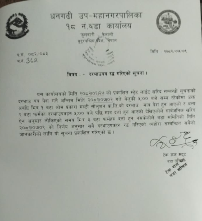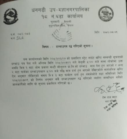 वडा नं १८ को दरभाउ पत्र रद्घ गरिएकव सम्बन्धी सूचना