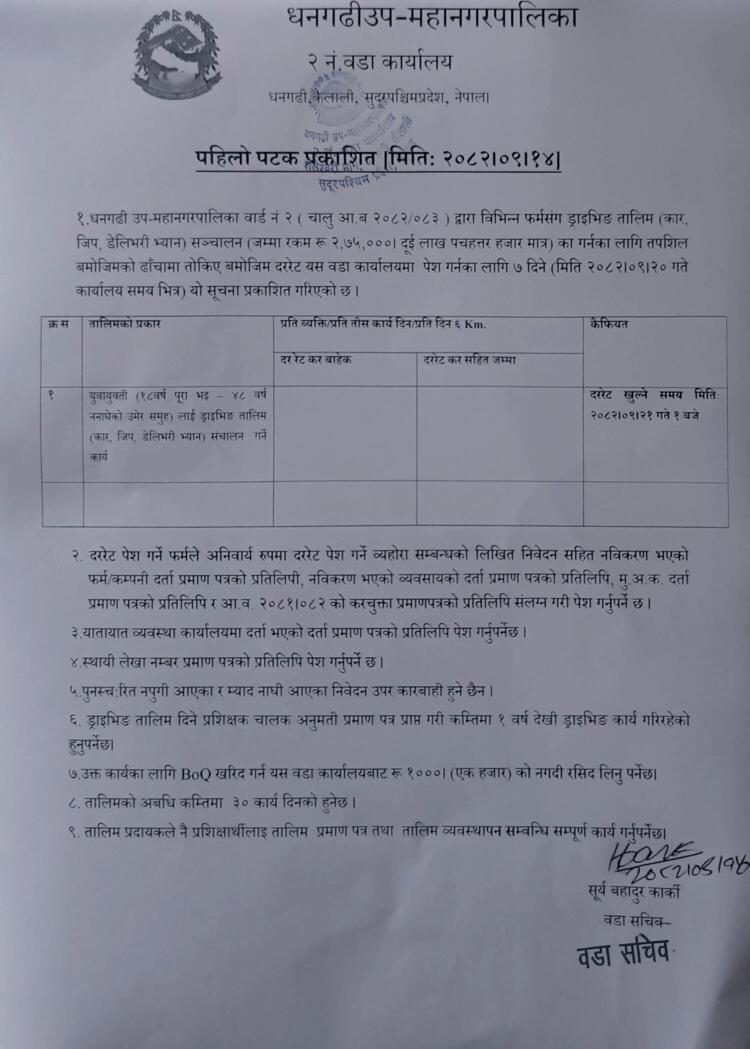 वडा नं २ को कार्यालयको युवायुवतीलाई ड्राइभिङ तालिम संचालन गर्ने कार्यका लागि दररेट पेश गर्ने सम्बन्धी सूचना
