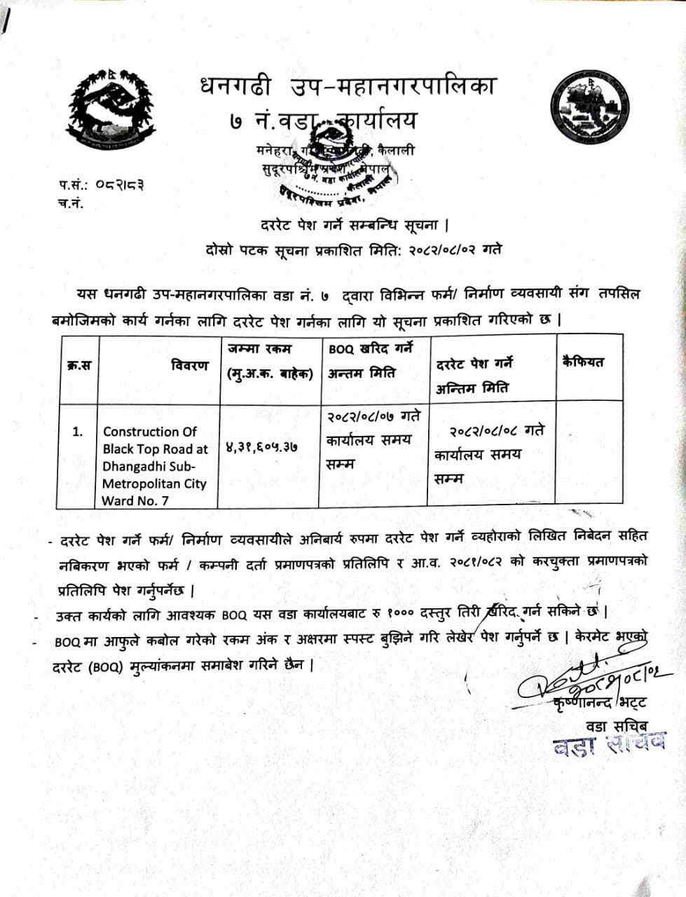 वडा नं ७ को दररेट पेश गर्ने सम्बन्धी सूचना (Construction of Black Top Road at Dhangadhi Sub-Metropolitan City Ward No 7)