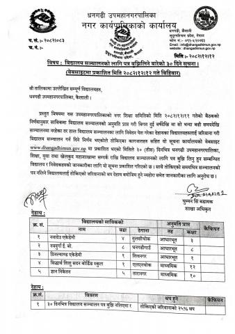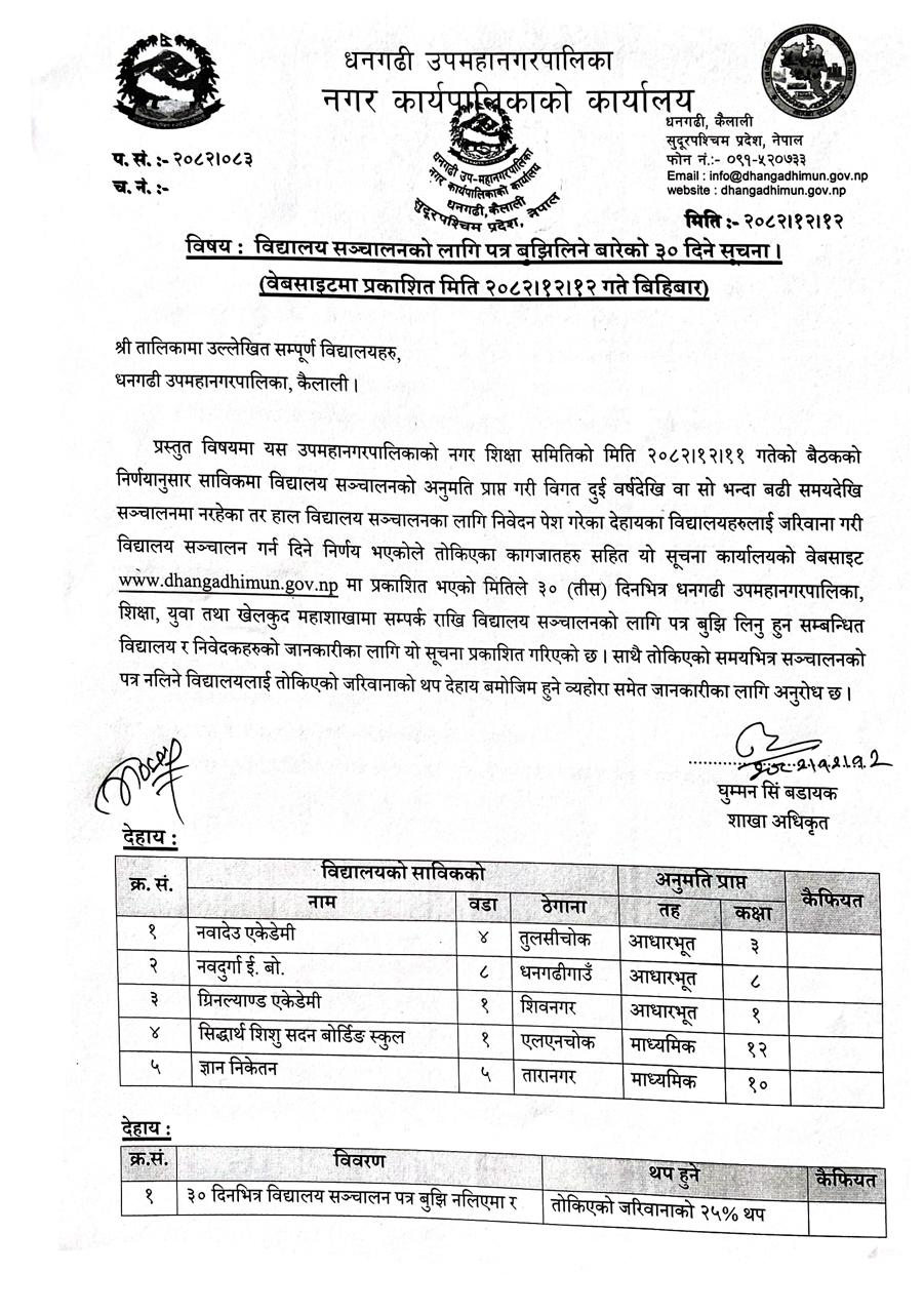 » विद्यालय सञ्चालनको लागि पत्र बुझिलिने बारेको ३० दिने सूचना ।