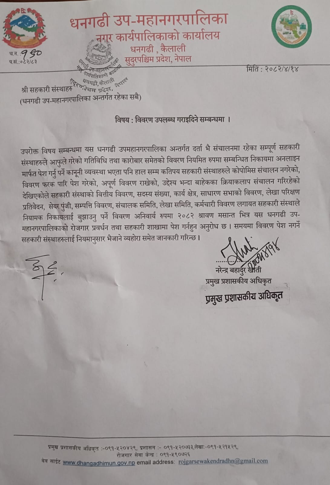 विवरण उपलब्ध गराइदिने सम्बन्धमा। [श्री सहकारी संस्थाहरु (धनगडी उपमहानगरपालिका अन्तर्गत रहेका सबै)]