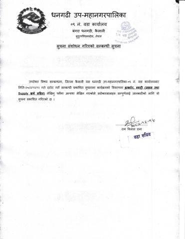 सूचना संशोदन गरिएको सम्बन्धी सूचना । [वडा नं ०९ को इन्भर्टर, ब्याट्री जडान तथा Supply खर्च सहित सम्बन्धी सूचना ]