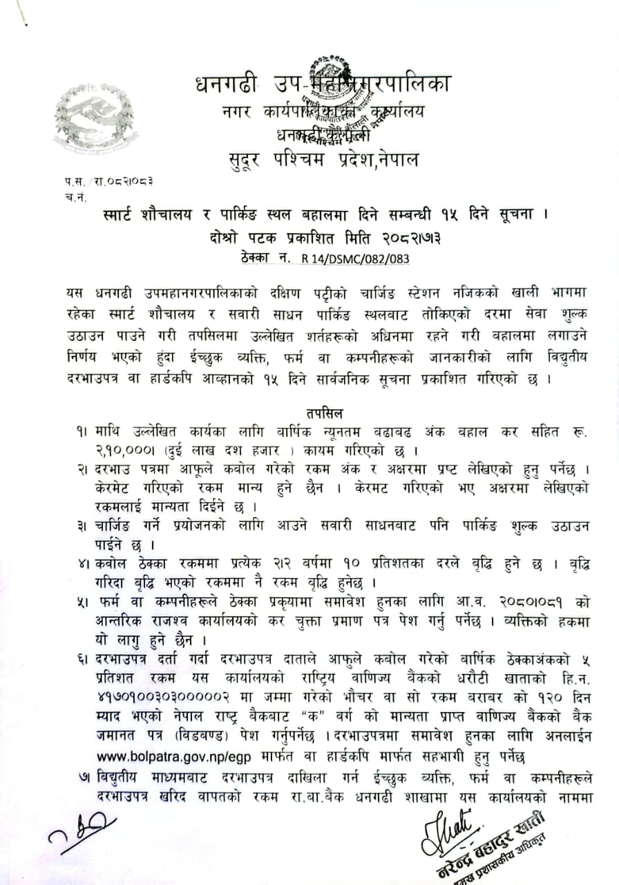 » स्मार्ट शौचालय र पार्किङ स्थल बहालमा दिने सम्बन्धी १५ दिने सूचना [दोश्रो पटक प्रकाशित]