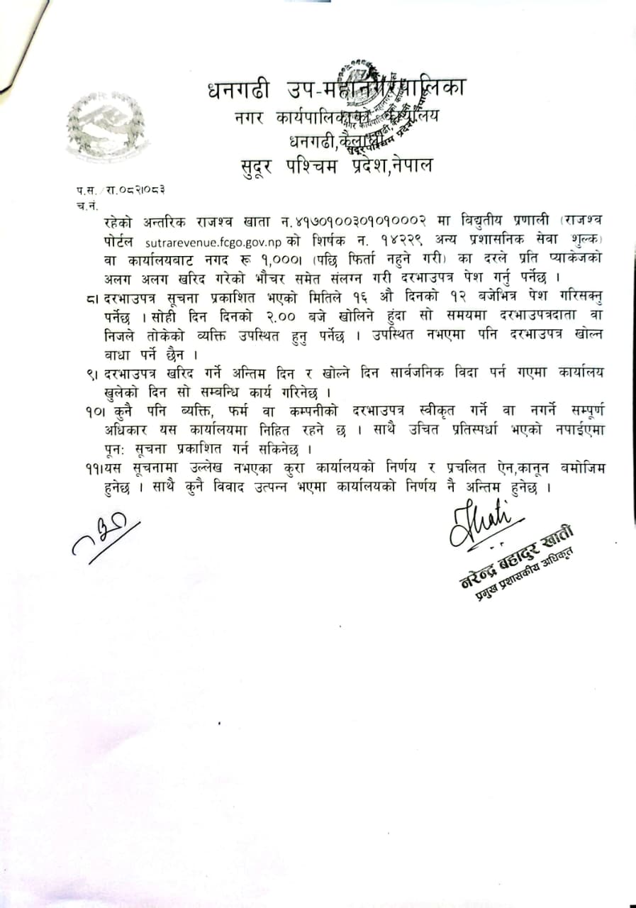धनगढी उप-महानगरपालिका वडा नं ४ सुत्केरी तथा गर्भवती महिलाहरुलाई पोषणयुक्त खानेकुरा वितरण सम्बन्धीका लागि दररेट आव्हान सम्बन्धी दोश्रो पटक प्रकाशित सूचना