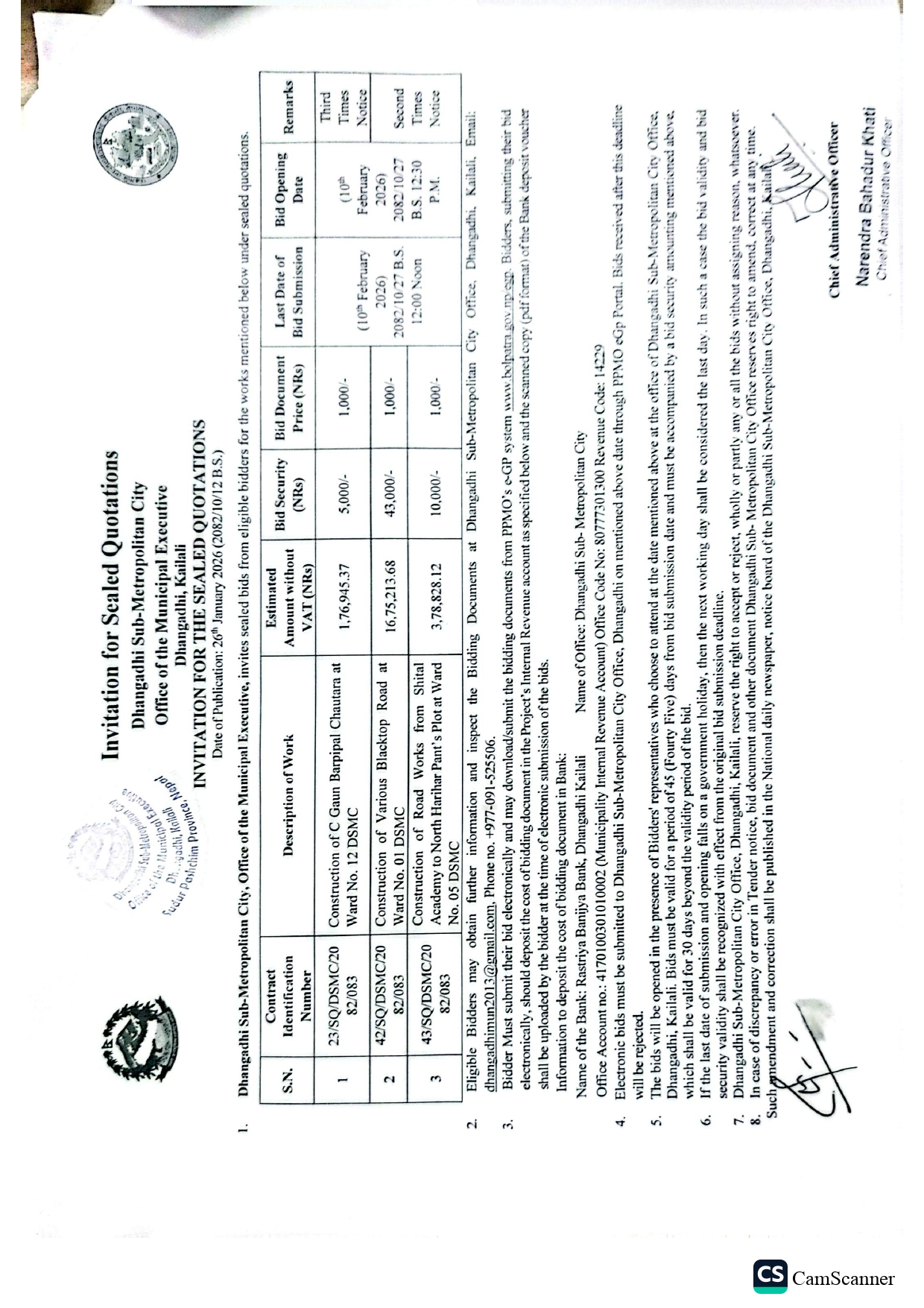 Invitation for the sealed quotations [Contract Id 23, 42, 43]