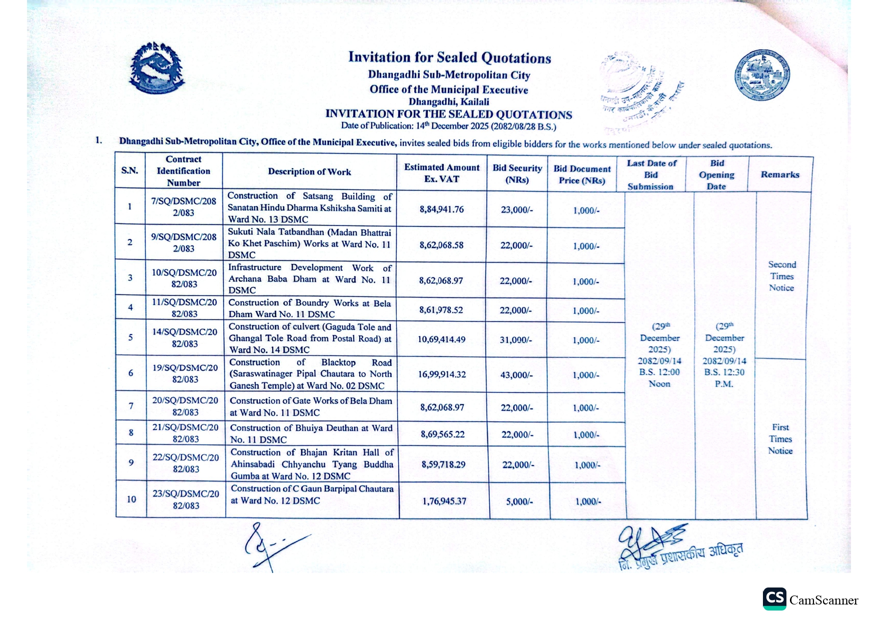 Invitation for the Sealed Quotations (Various Construction Works)