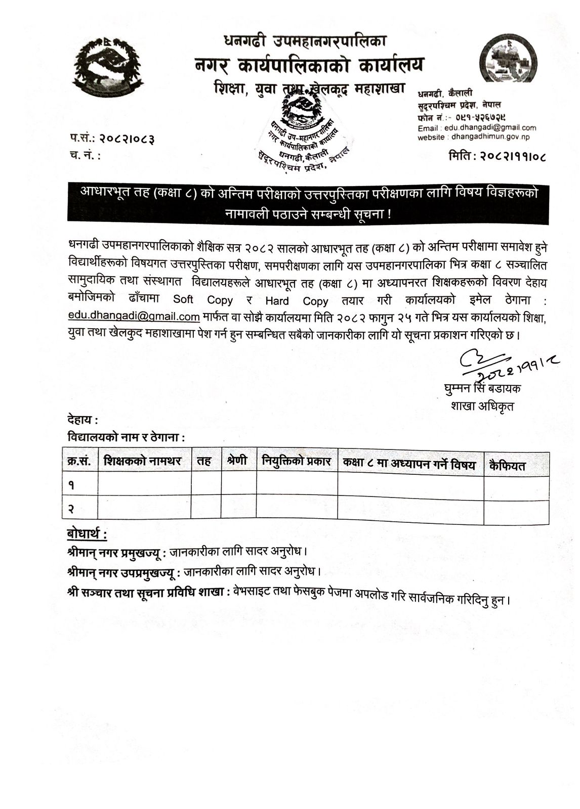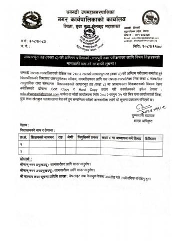आधारभूत तह (कक्षा ८) को अन्तिम परीक्षाको उत्तरपुस्तिका परीक्षणका लागि विषय विज्ञहरूको नामावली पठाउने सम्बन्धी सूचना !