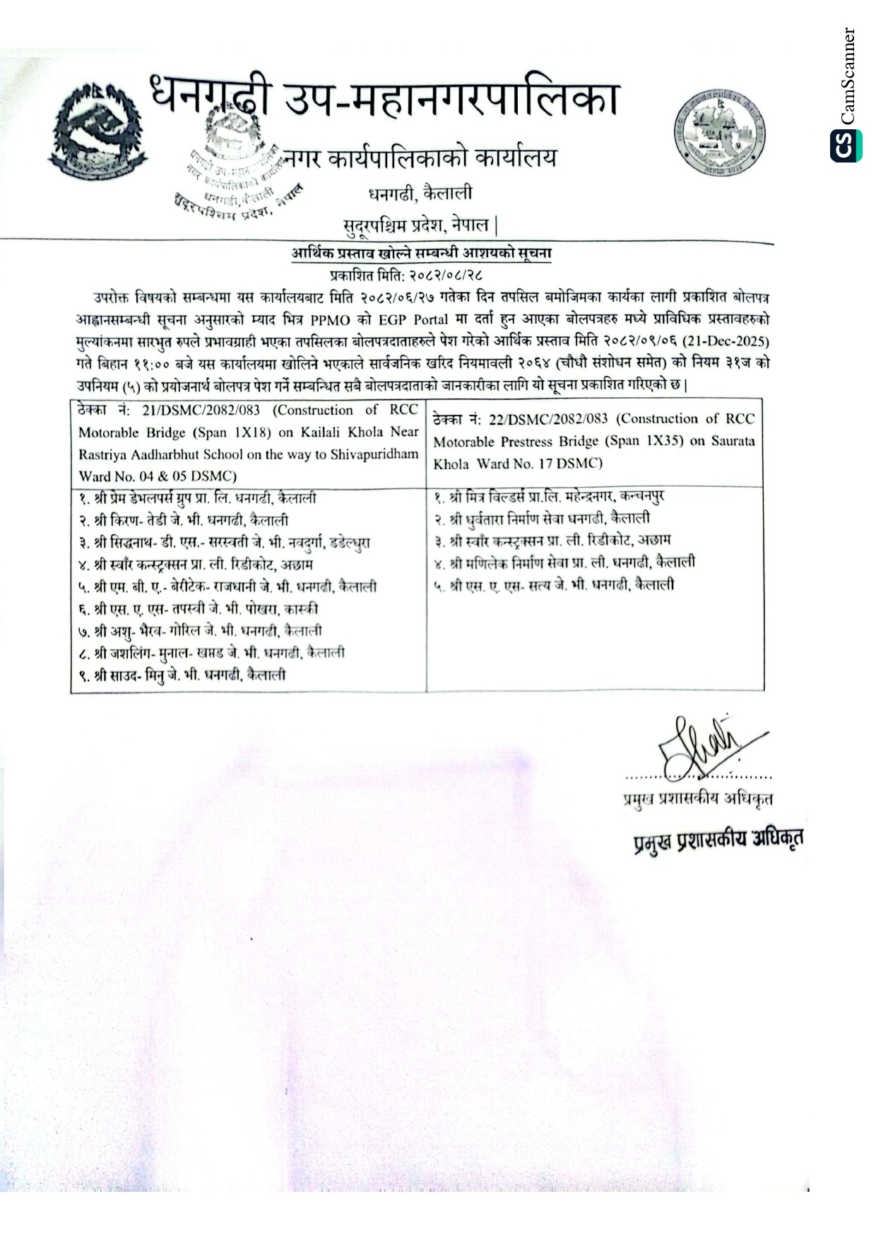 आर्थिक प्रस्ताव खोल्ने सम्बन्धी आशयको सूचना