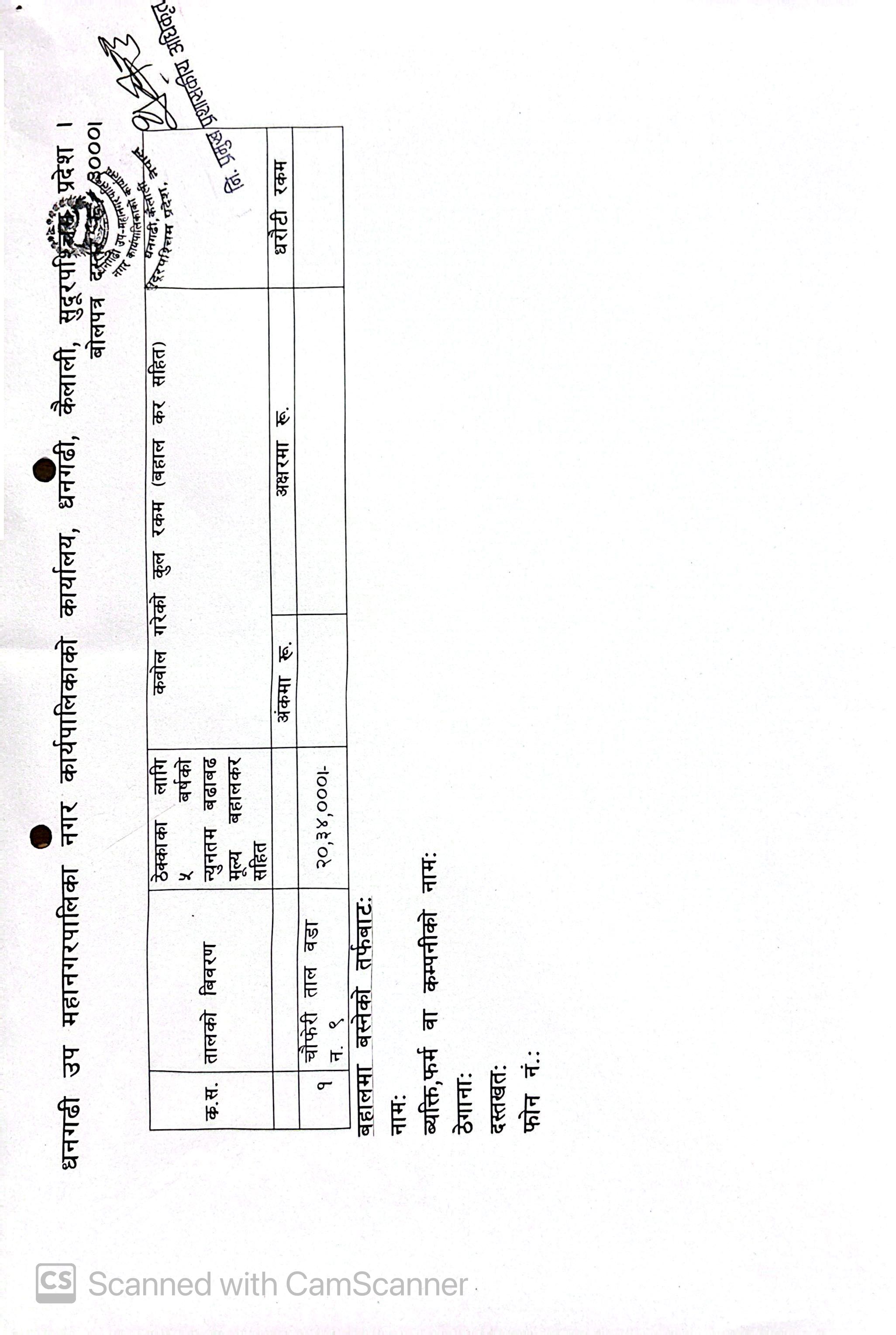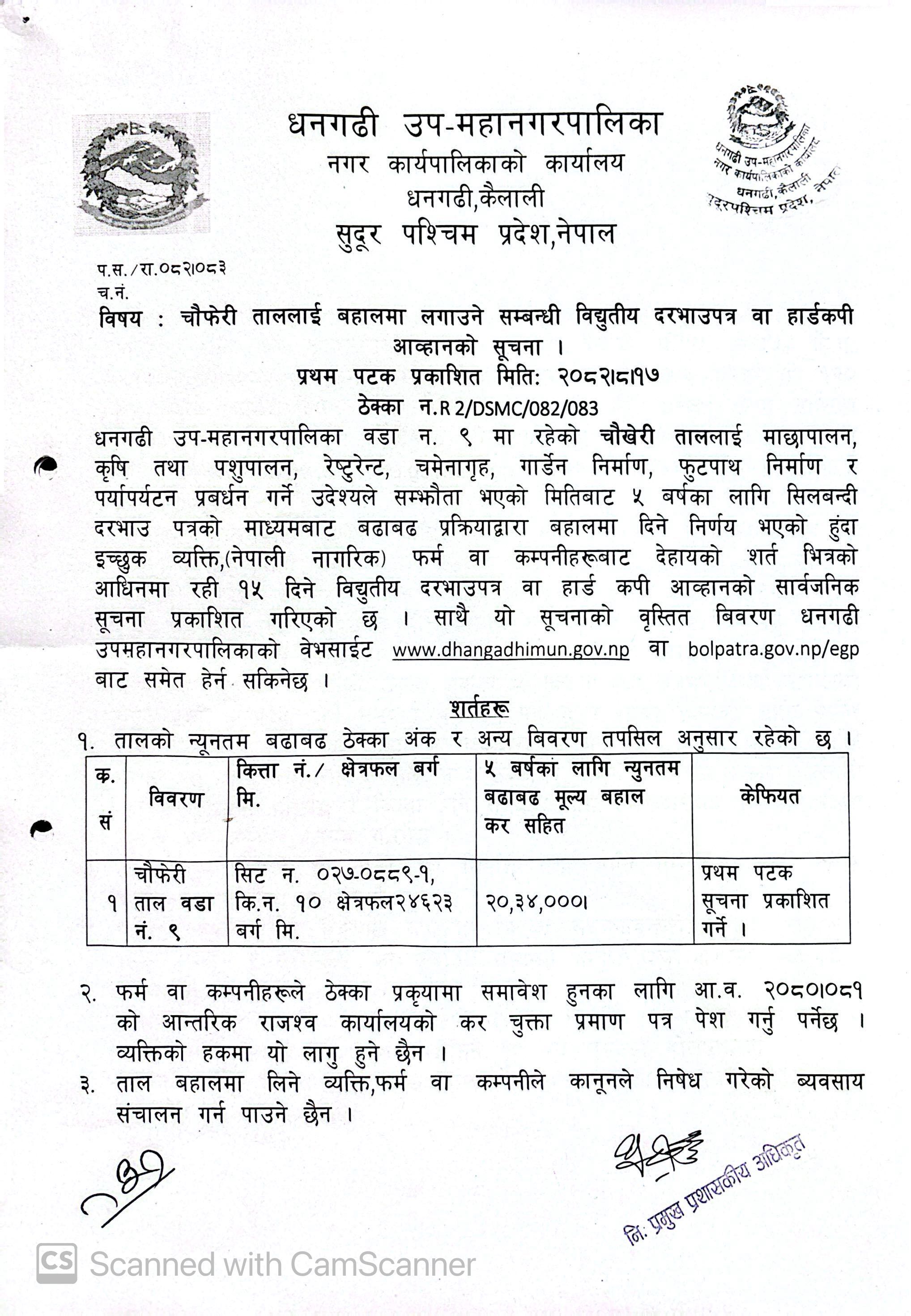 चौफेरी ताललाई बहालमा लगाउने सम्बन्धी विद्युतीय दरभाउ वा हार्डकपी आव्हानको सूचना । [प्रथम पटक प्रकाशित]