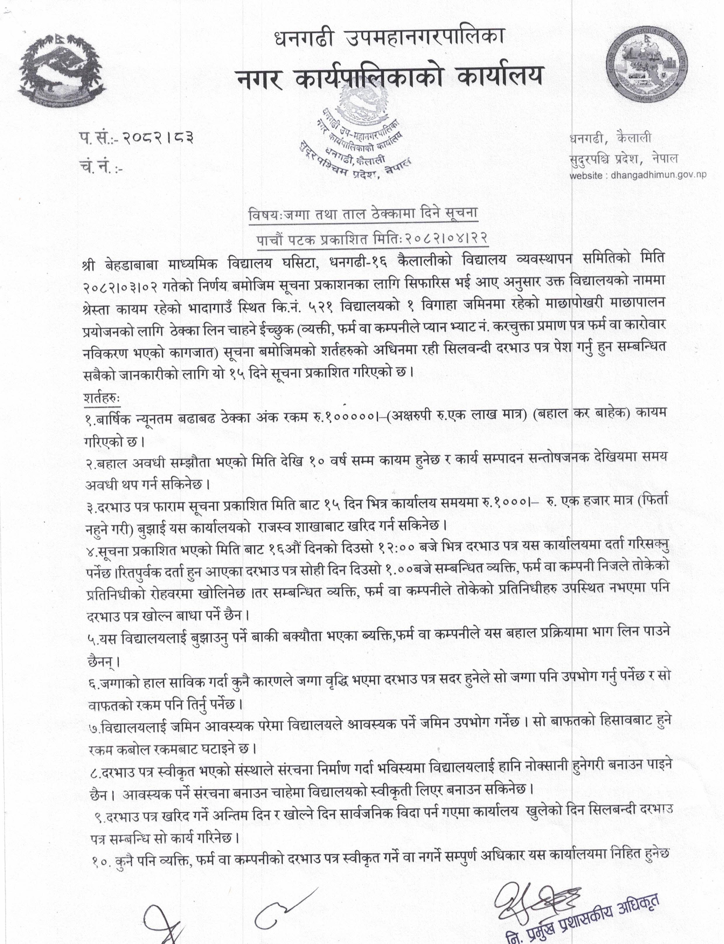 » जग्गा तथा ताल ठेक्कामा दिने सूचना [श्री बहेडाबाबा मावि, घसिटा -१६]