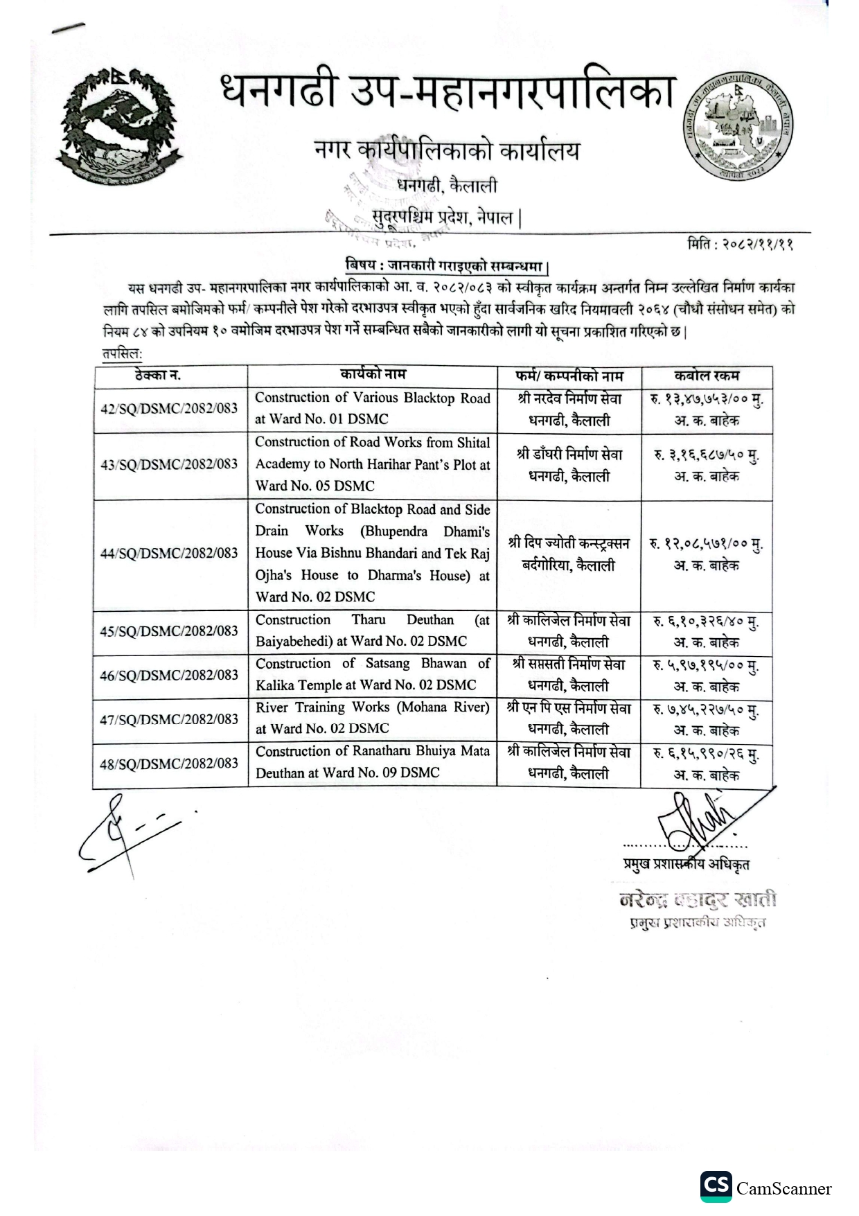 जानकारी गराइएको सम्बन्धमा [ठेक्का नं 42-47]