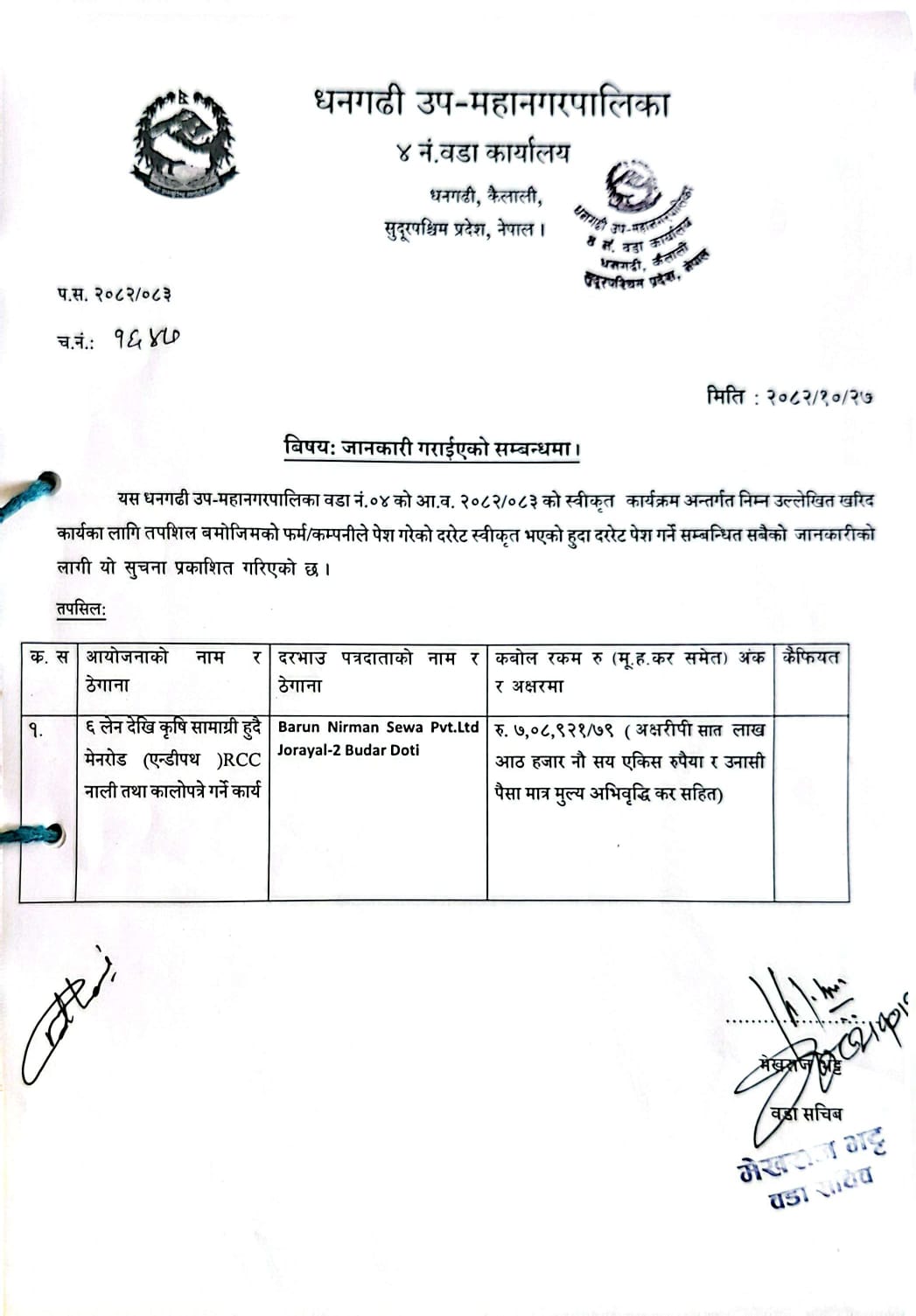 जानकारी गराईएको सम्बन्धमा [वडा नं ०४ RCC नाली तथा कालोपत्रे गर्ने कार्य]