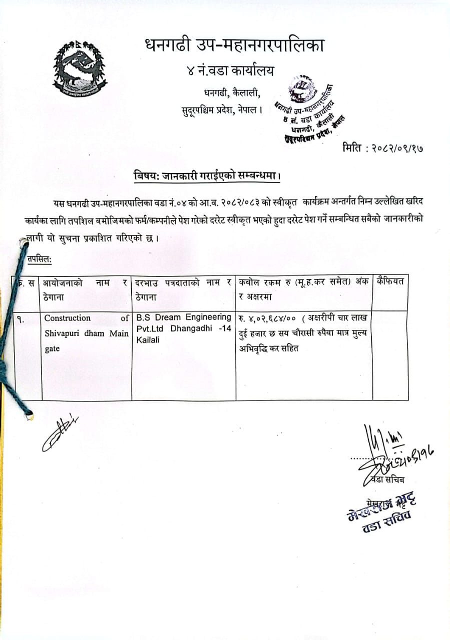 वडा नं १२ को दररेट पेश गर्ने सम्बन्धी सूचना[Construction of various works]