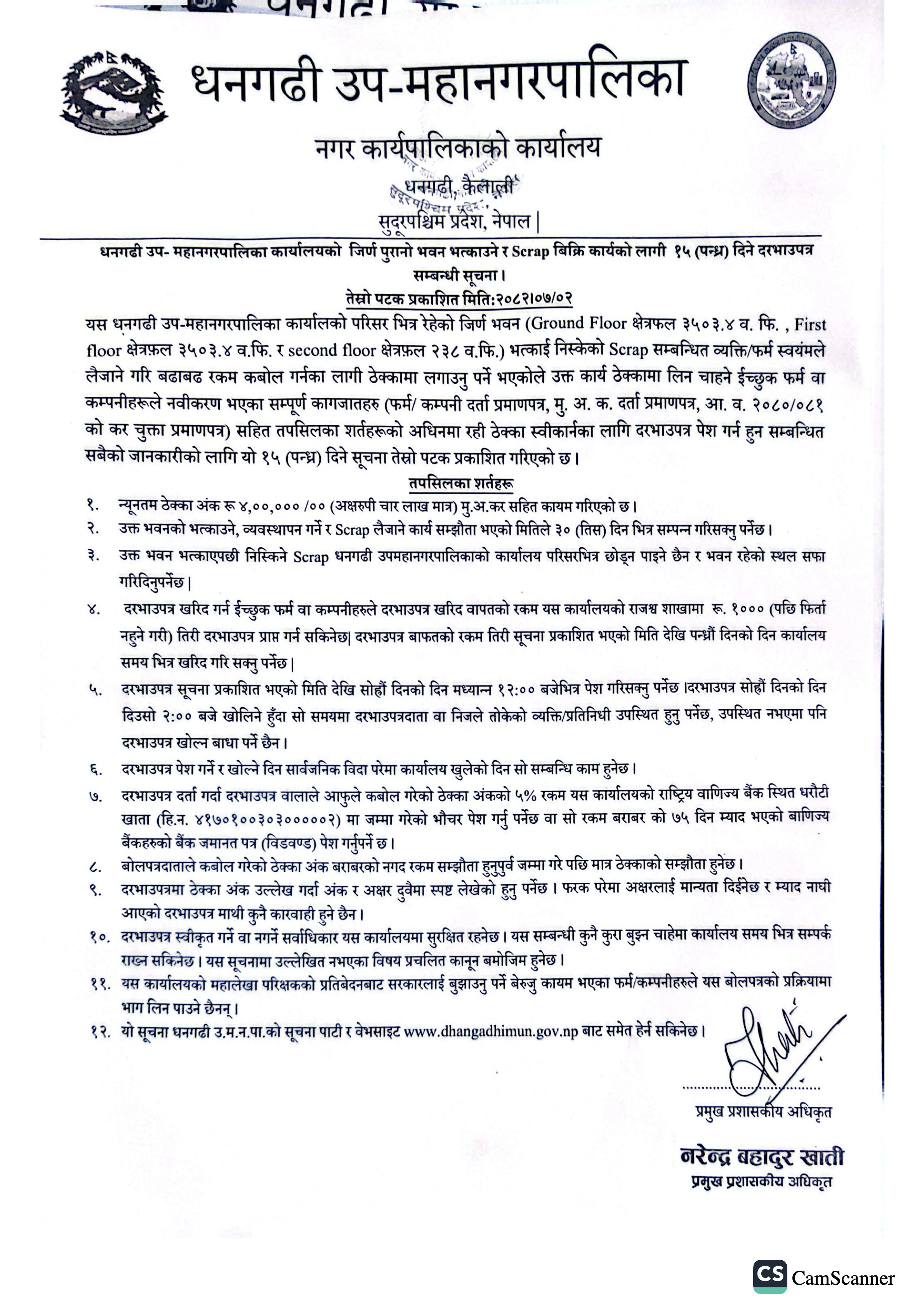 » जिर्ण पुरानो भवन भत्काउने र Scrap विक्रि कार्यको लागि १५ दिने सूचना (तेस्रो पटक)