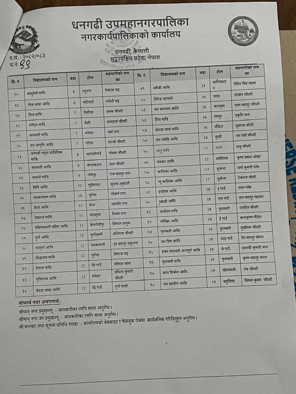 धनगढी उप-महानरपालिका वडा नं- १६ को सामुदायिक विद्यालयमा प्ले स्टेसन जडानको लागि दरभाउ पत्र स्वीकृत गर्ने सम्बन्धी आशयको सूचना