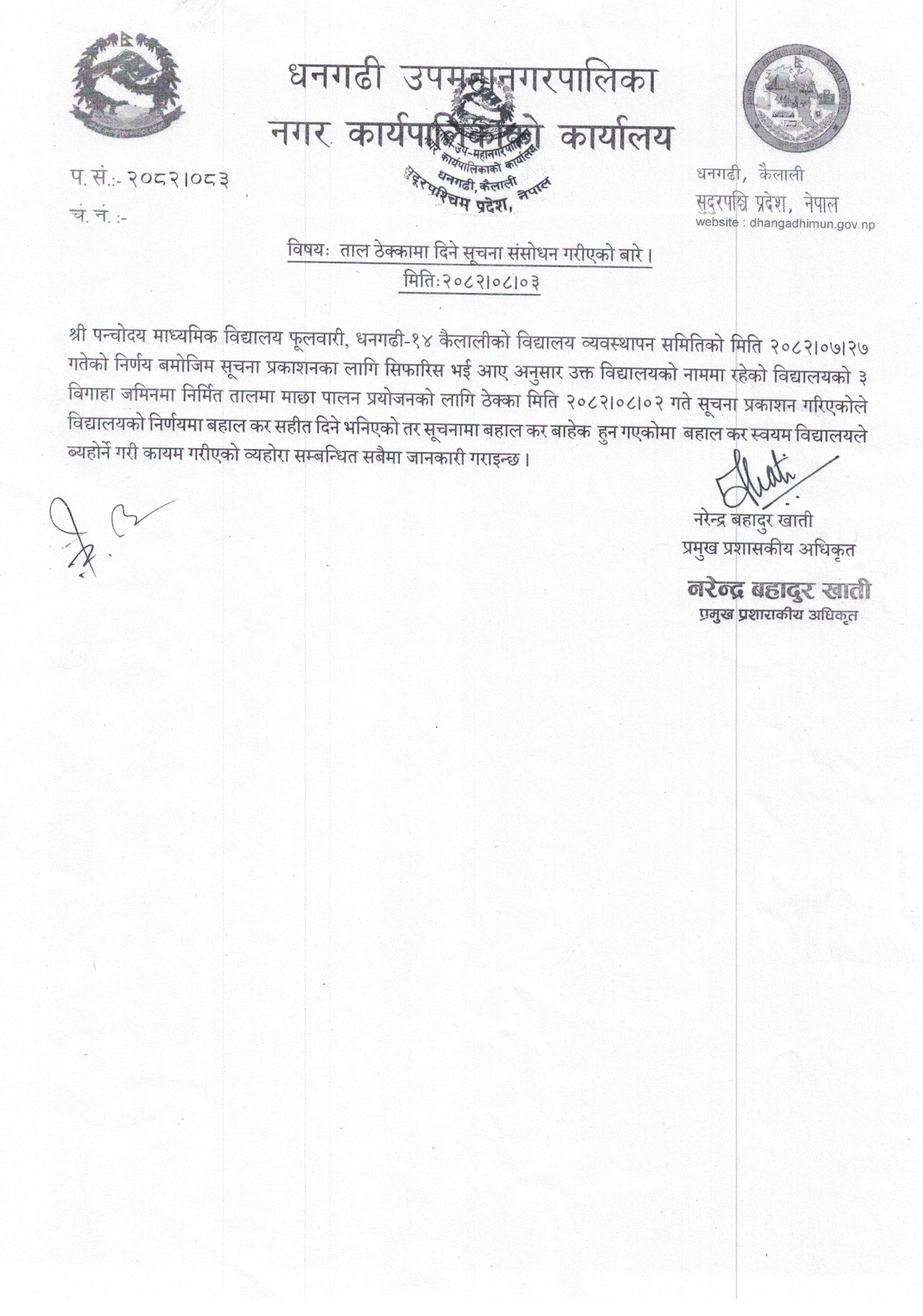 ताल ठेक्कामा दिने सूचना संशोधन गरिएको बारे (श्री पञ्चोदय माध्यमिक विद्यालय फूलबारी, धनगढी १४ कैलाली)
