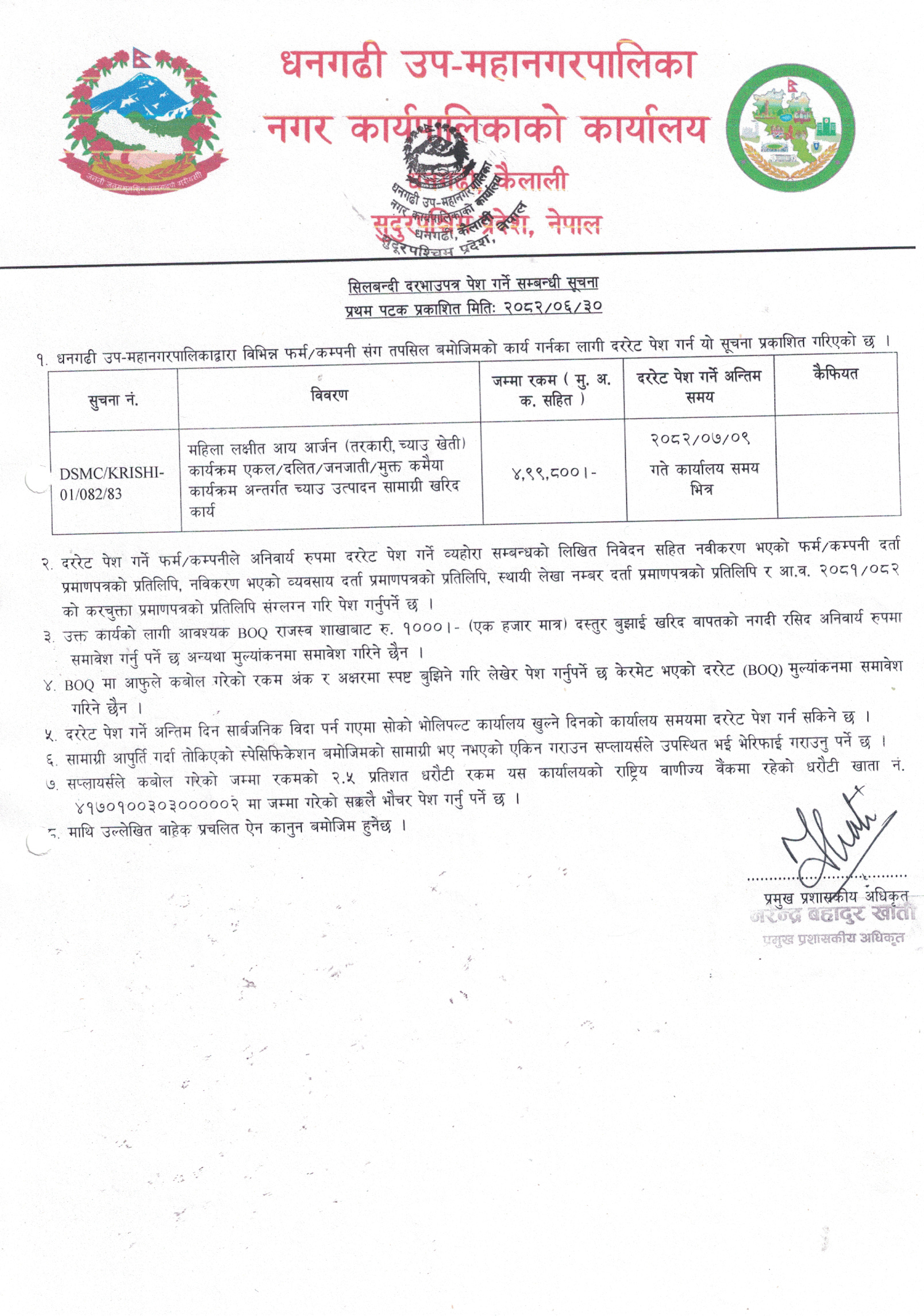 दररेट पेश गर्ने सम्बन्धी सूचना [महिला लक्षीत आय आर्जन (तरकारी,च्याउ खेती) कार्यक्रम एकल/दलित/जनजाती/मुक्त कमैया कार्यक्रम अन्तर्गत च्याउ उत्पादन सामग्री खरिद कार्य]