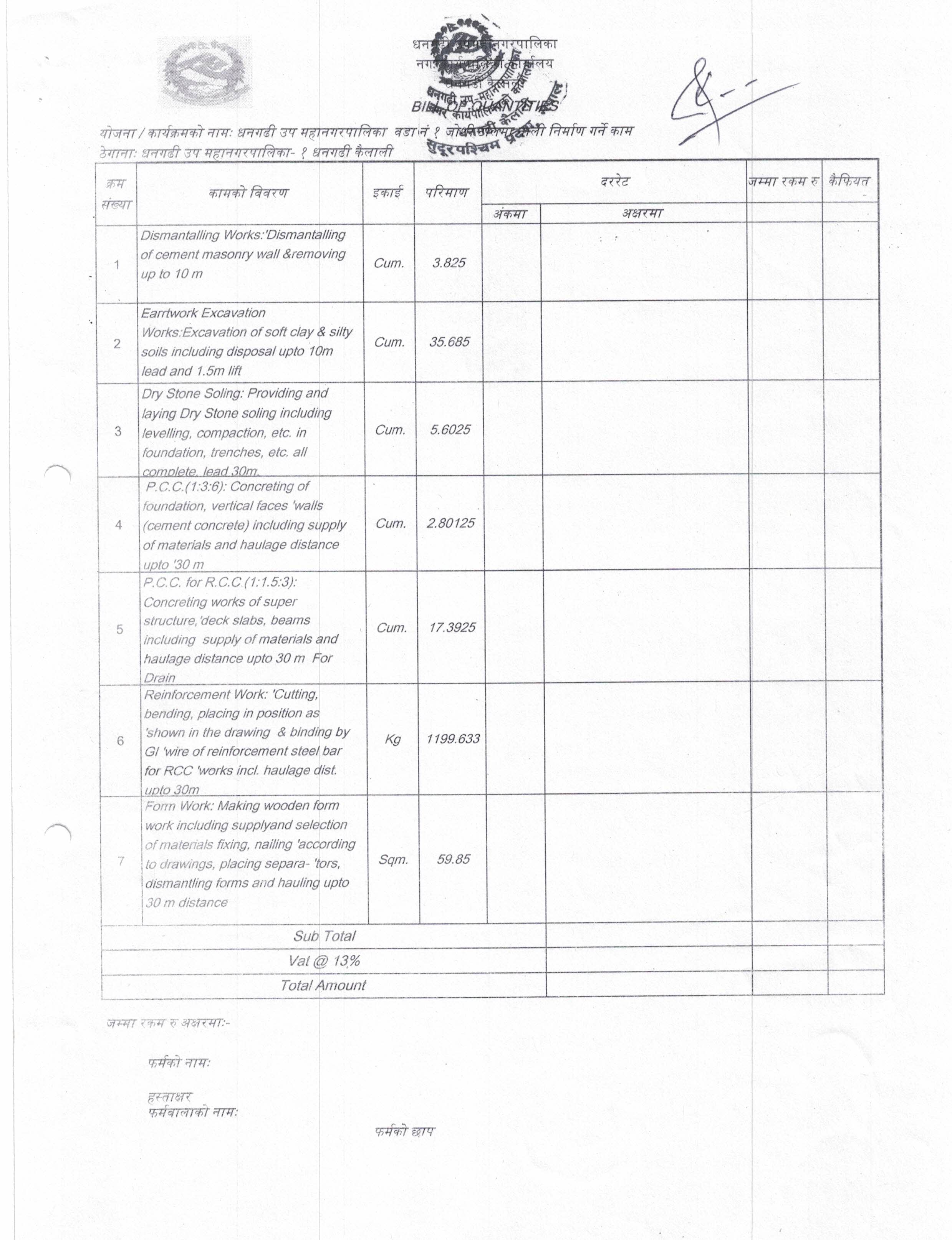 दररेट पेश गर्ने सम्बन्धी सूचना । [Seven Days Mason Training for 35 Nos. of Local Mason including all materials, theoritical and Practical Classes as per the training course jointly prepared by the Department of Urban Development and building Construction