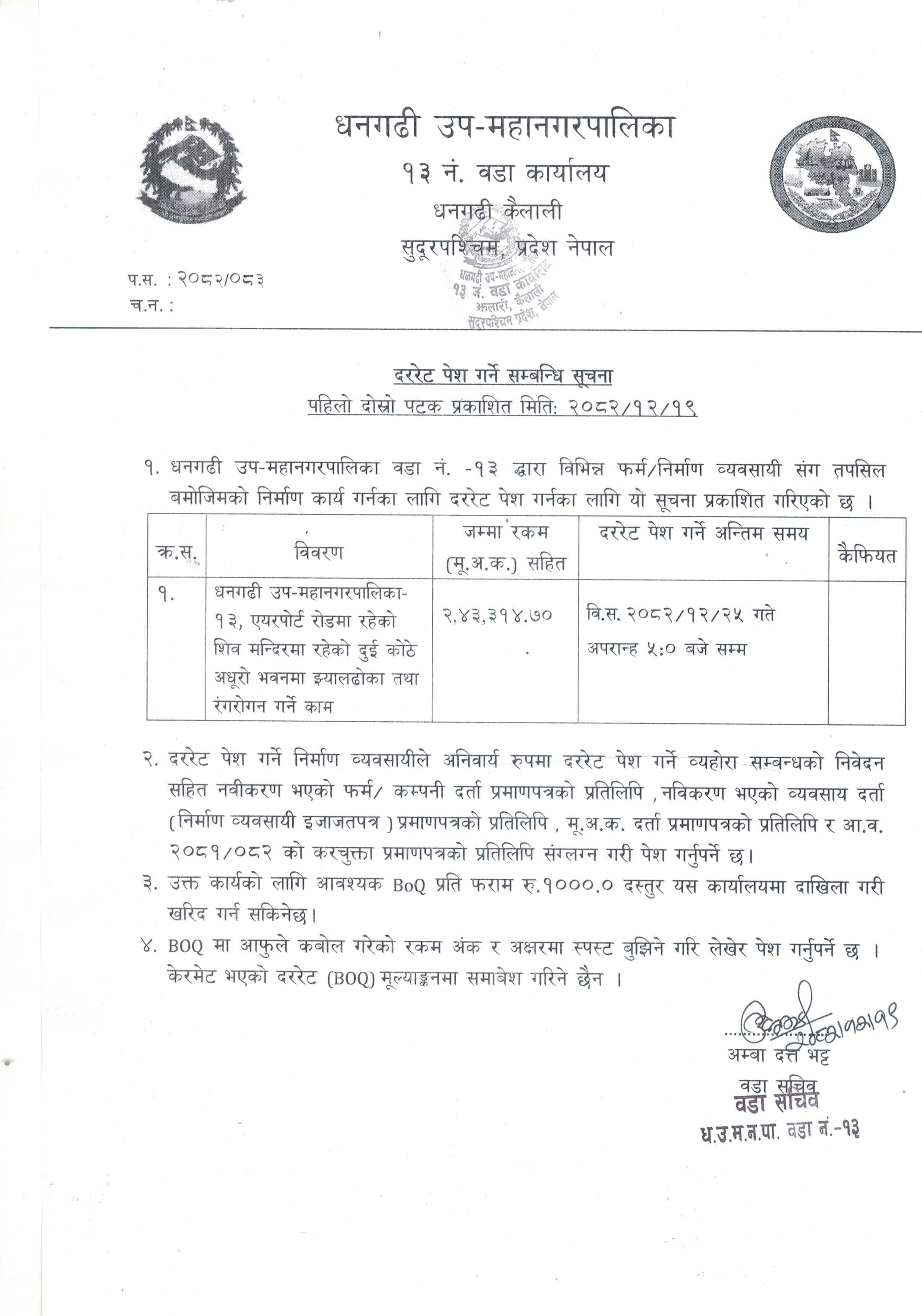 दररेट पेश गर्ने सूचना [ वडा नं १३ , एयरपोर्ट रोडमा रहेको शिव मन्दिरमा रहेको दुई कोठे अधुरो भवनमा झ्याल ढोका तथा रंगरोगन गर्ने काम ]