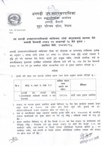 » धनगढी उपमहानगरपालिकाको स्वामित्वमा रहेको कोठाहरुलाई बहालमा दिने सम्बन्धी सिलबन्दी दरभाउ पत्र आव्हानको १५ दिने सूचना ।