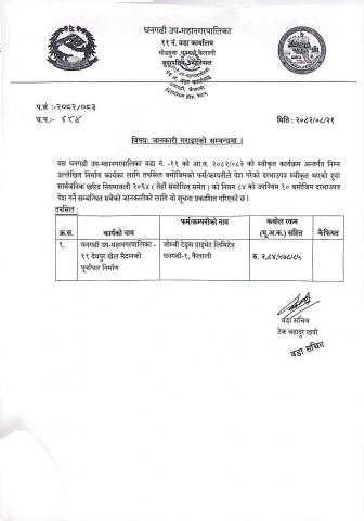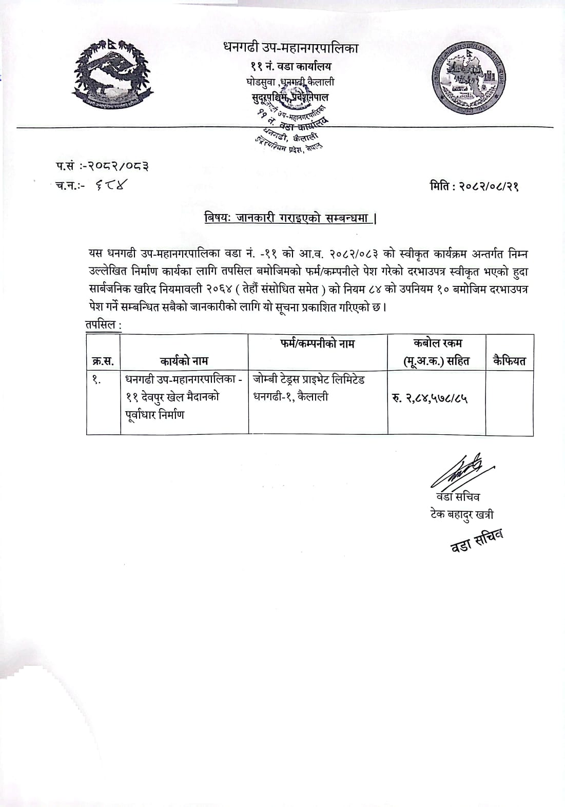 » धनगढी उप महानगरपालिका वडा नं ११ को देवपुर खेल मैदानको पूर्वाधार निर्माण सम्बन्धी जानकारी गराइएको सम्बन्धी सूचना