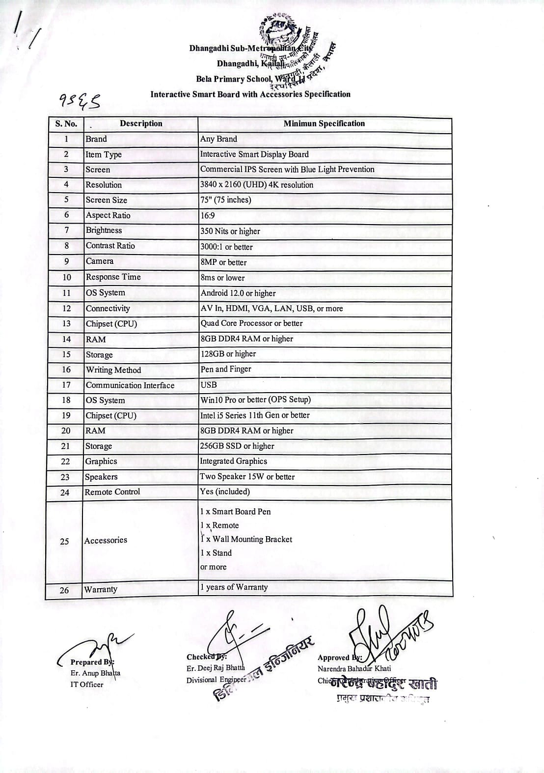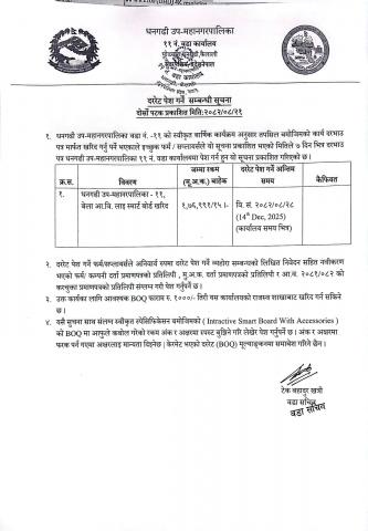 » धनगढी उप महानगरपालिका वडा नं ११ को बेला आ.वि. लाई स्मार्ट बोर्ड खरिद सम्बन्धी दररेट पेश गर्ने सम्बन्धी सूचना (दोश्रो पटक प्रकाशित)