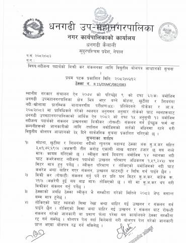 नदीजन्य पदार्थको बिक्री कर संकलनका लागि विधुतीय बोलपत्र आव्हानको सूचना ।