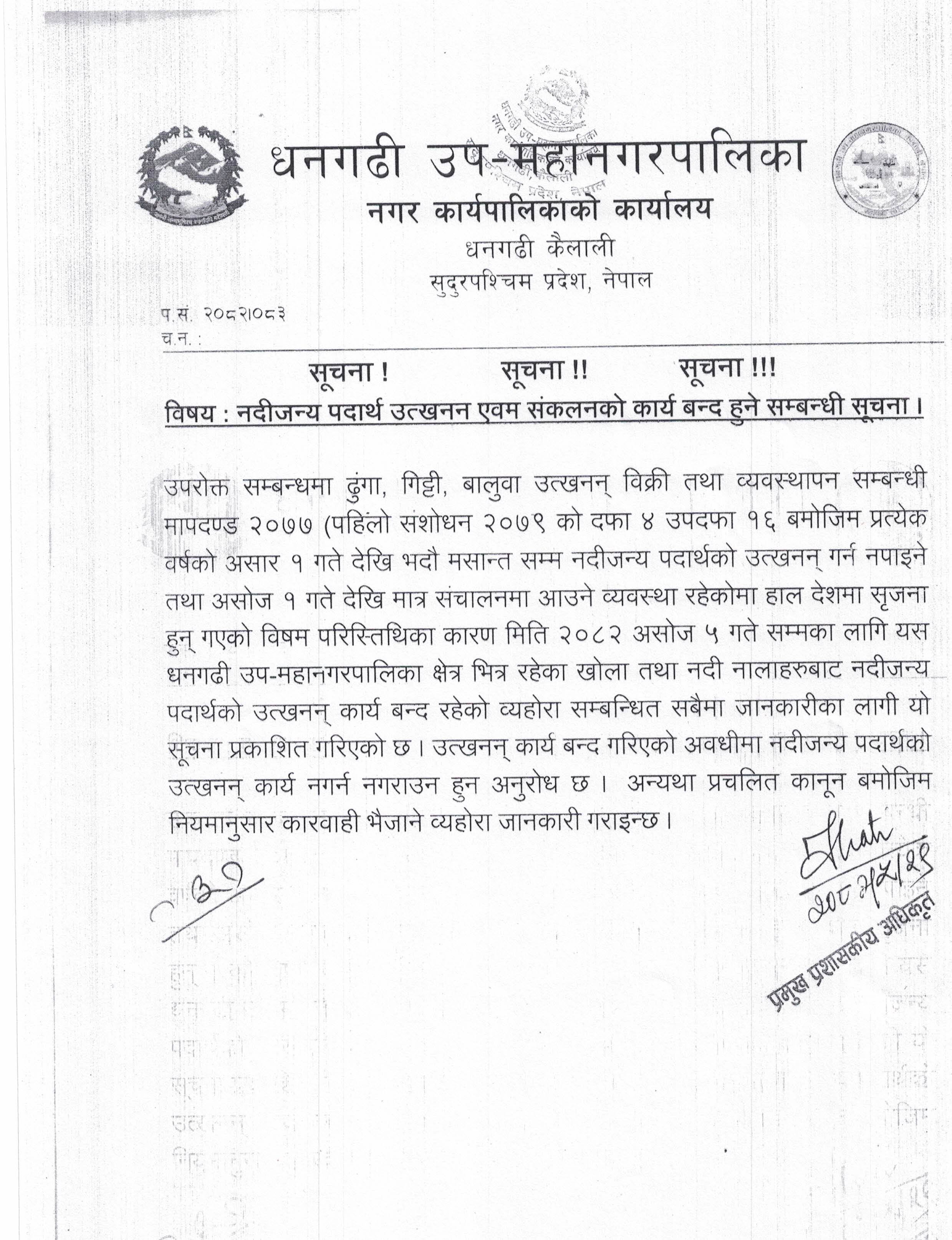 नदीजन्य पदार्थ उत्खनन एवम संकलनको कार्य बन्द हुने सम्बन्धी सूचना ।