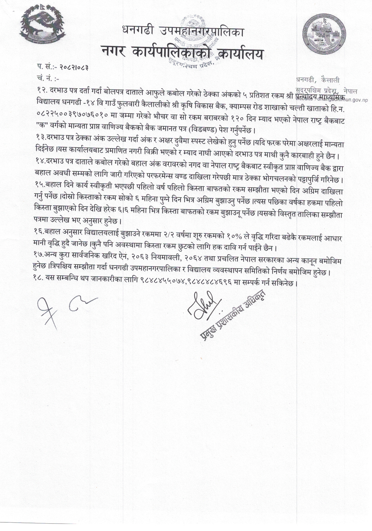 » पन्चोदय माध्यमिक विद्यालय, धनगढी १४ बि गाउँ को जग्गा तथा ताल ठेक्कामा दिने सम्बन्धी सूचना [चौथो पटक प्रकाशित]