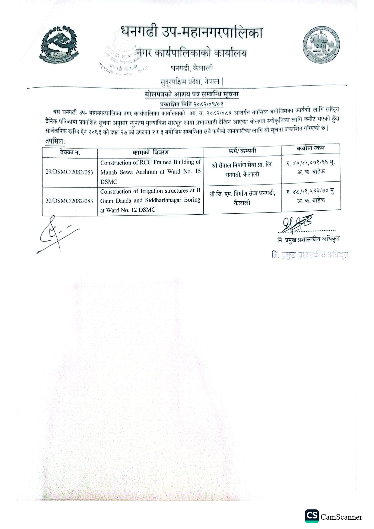 बोलपत्रको आशय पत्र सम्बन्धी सूचना [ठेक्का नं ४८, ५०, ५१, ५२, ५३, ५४, ५५, ५६, ५८]