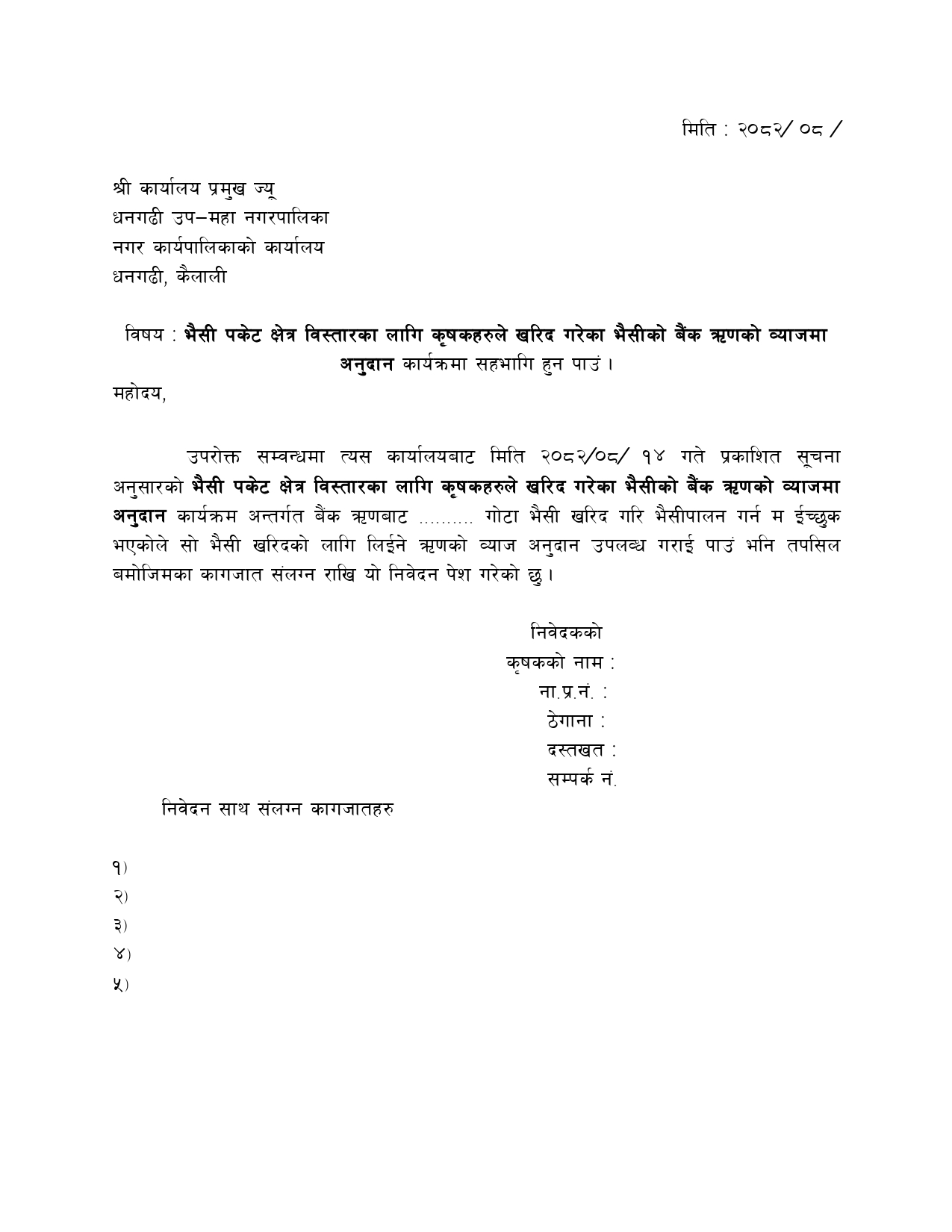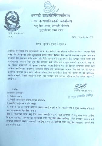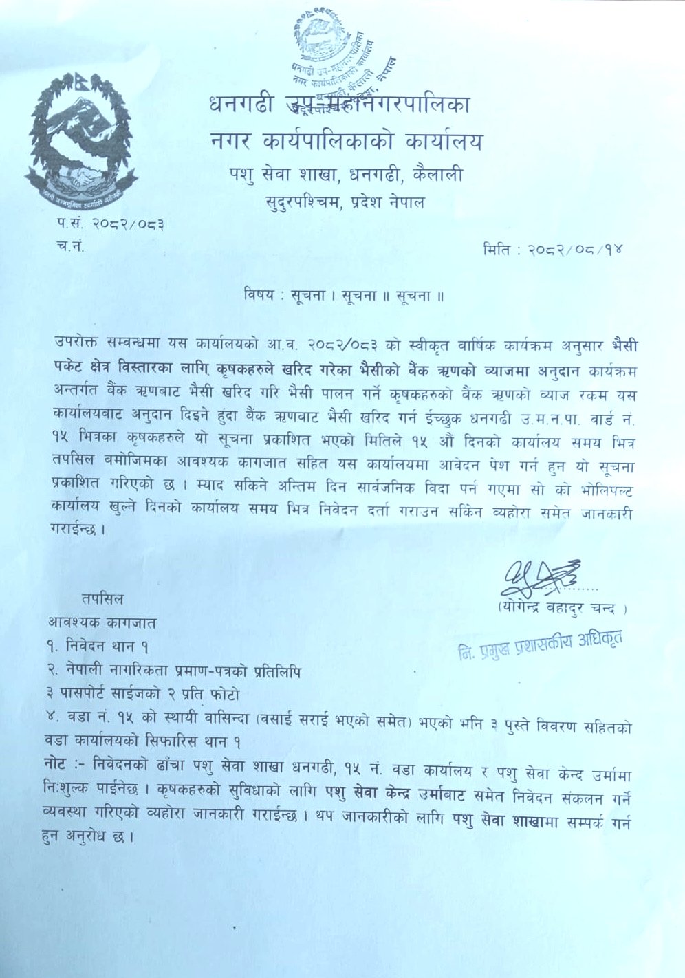 भैंसी पकेट क्षेत्र विस्तारका लागि कृषकहरुले खरिद गरेको भैंसीको बैंक ऋणको ब्याजमा अनुदान सम्बन्धी धनगढी उप महानगरपालिकाको सूचना