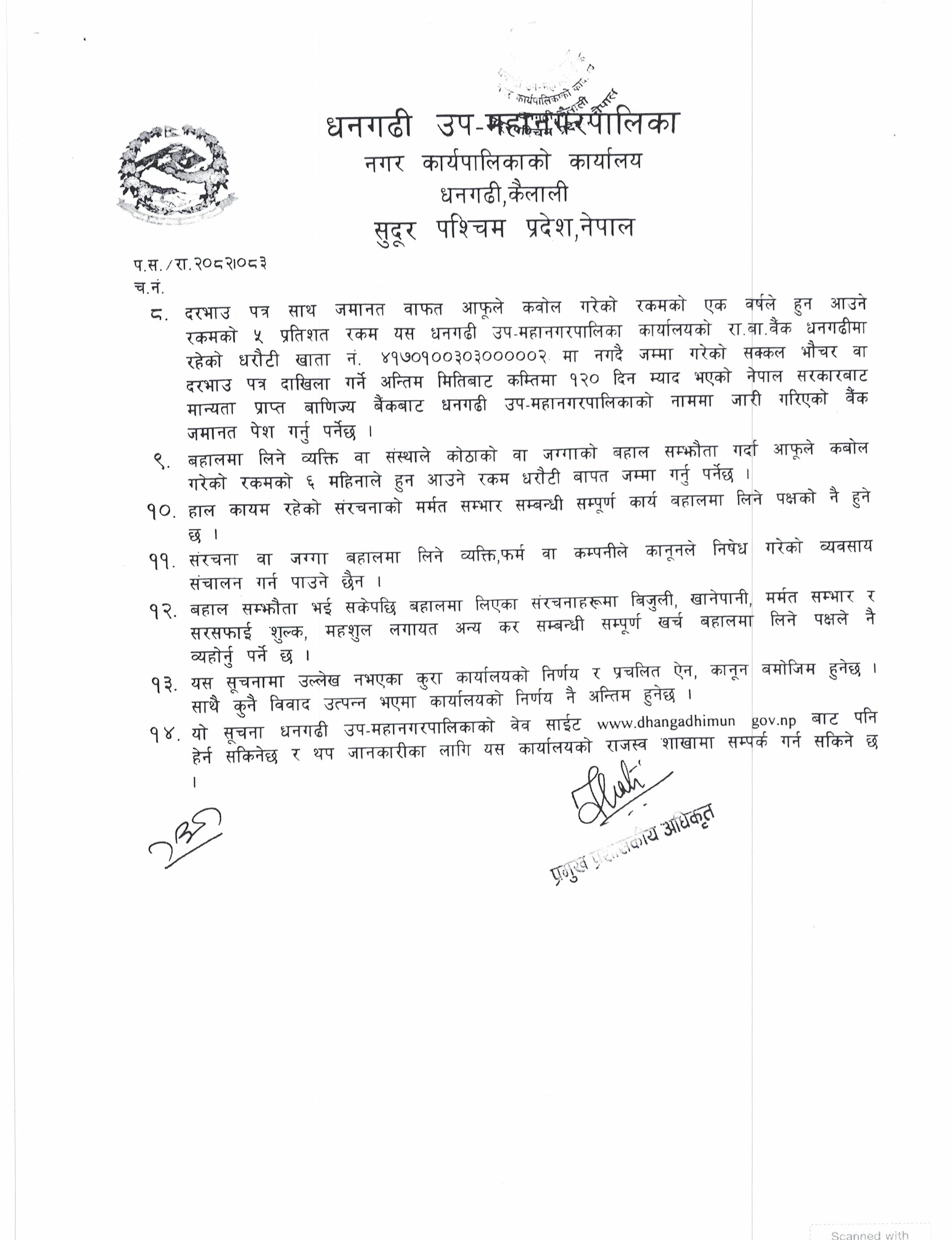 » यस धनगढी उपमहानगरपालिकाको स्वामित्वमा रहेको कोठाहरुलाई बहालमा दिने सम्बन्धी सिलबन्दी दरभाउ पत्र आव्हानको १५ दिने सूचना ।
