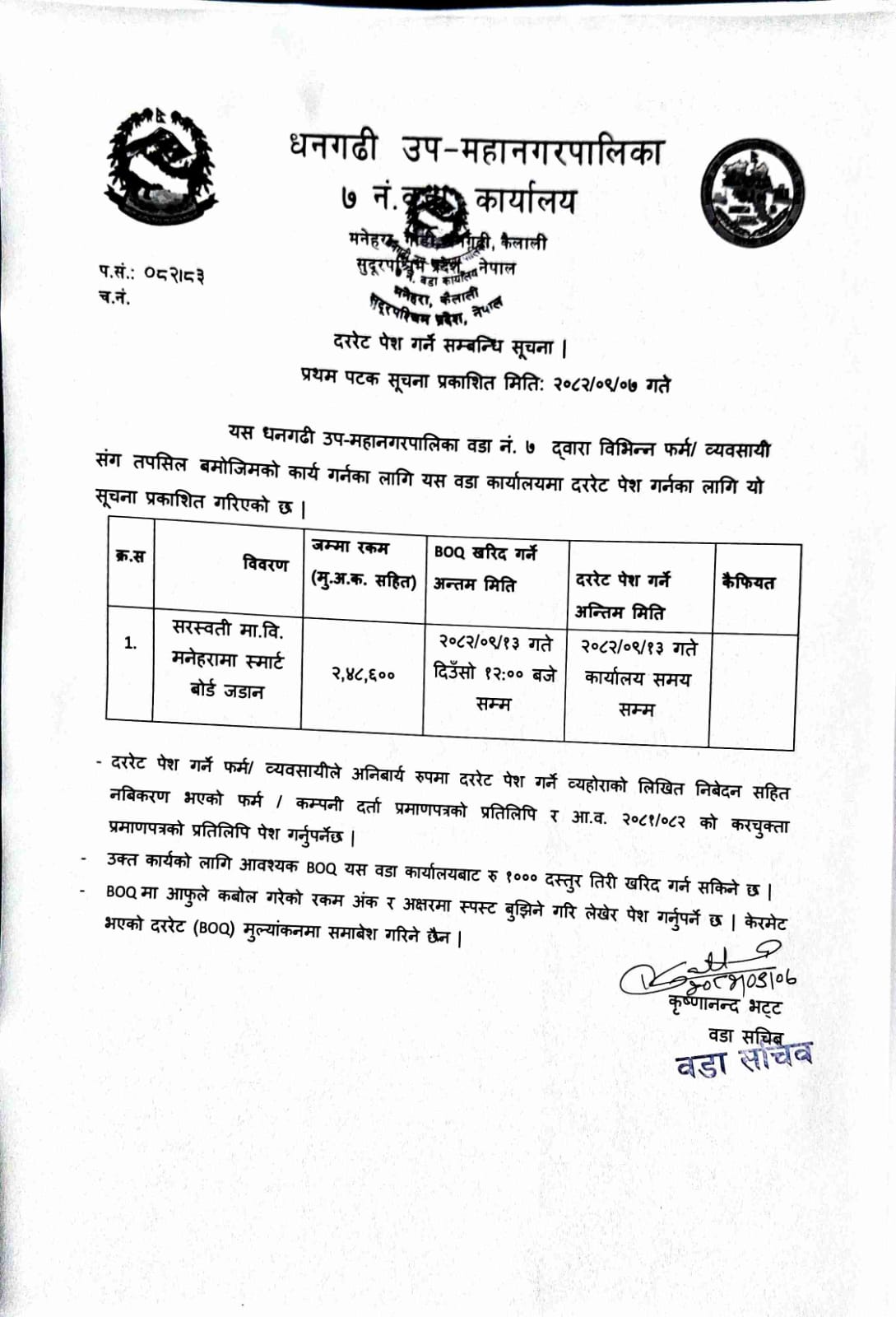 वडा नं ०७ को दररेट पेश गर्ने सम्बन्धी सूचना [सरस्वती मा.वि. मनेहरमा स्मार्ट बोर्ड जडान]