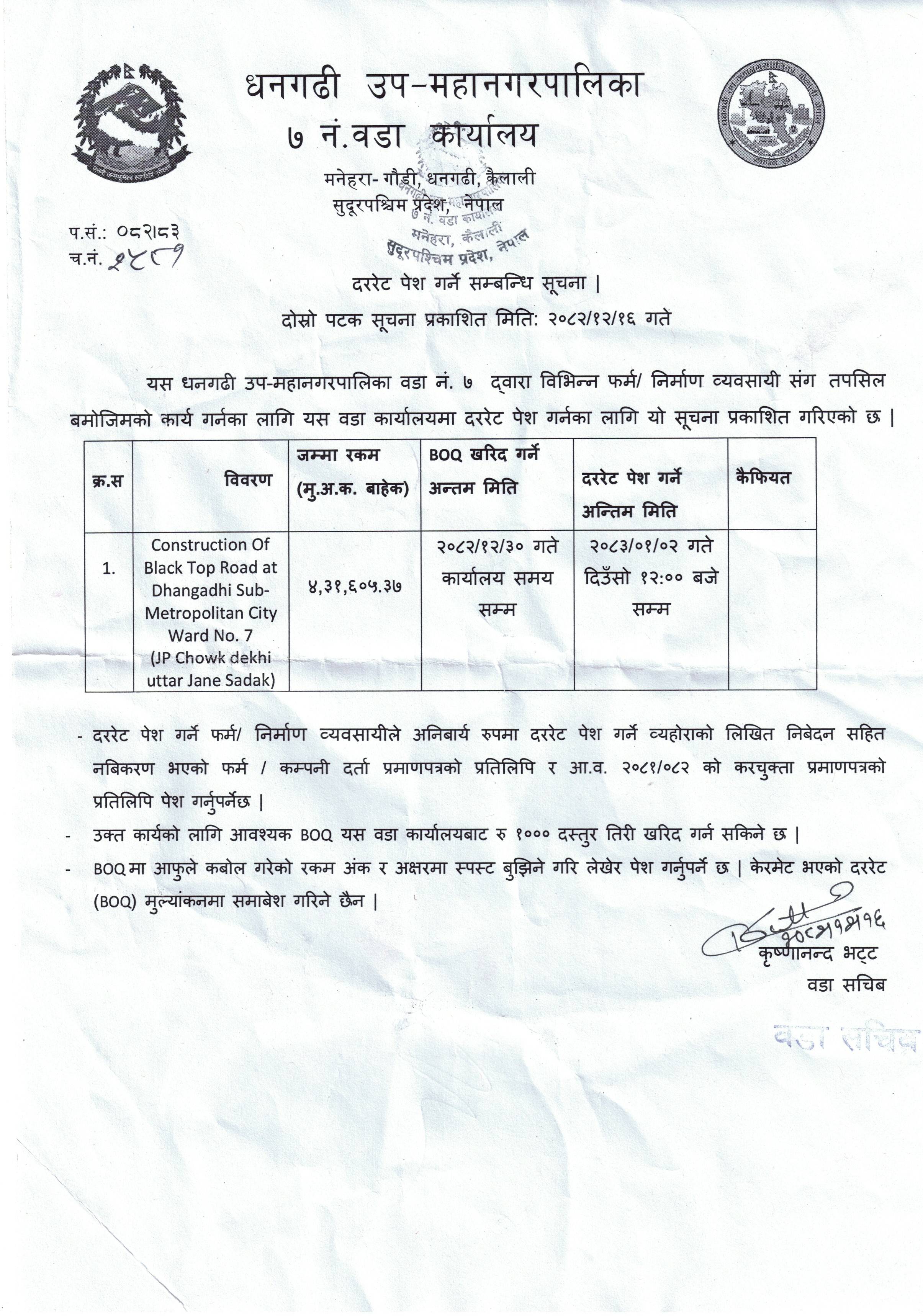वडा नं ०७ को दररेट पेश गर्ने सम्बन्धी सूचना [Construction of Black top road at ward no 7]