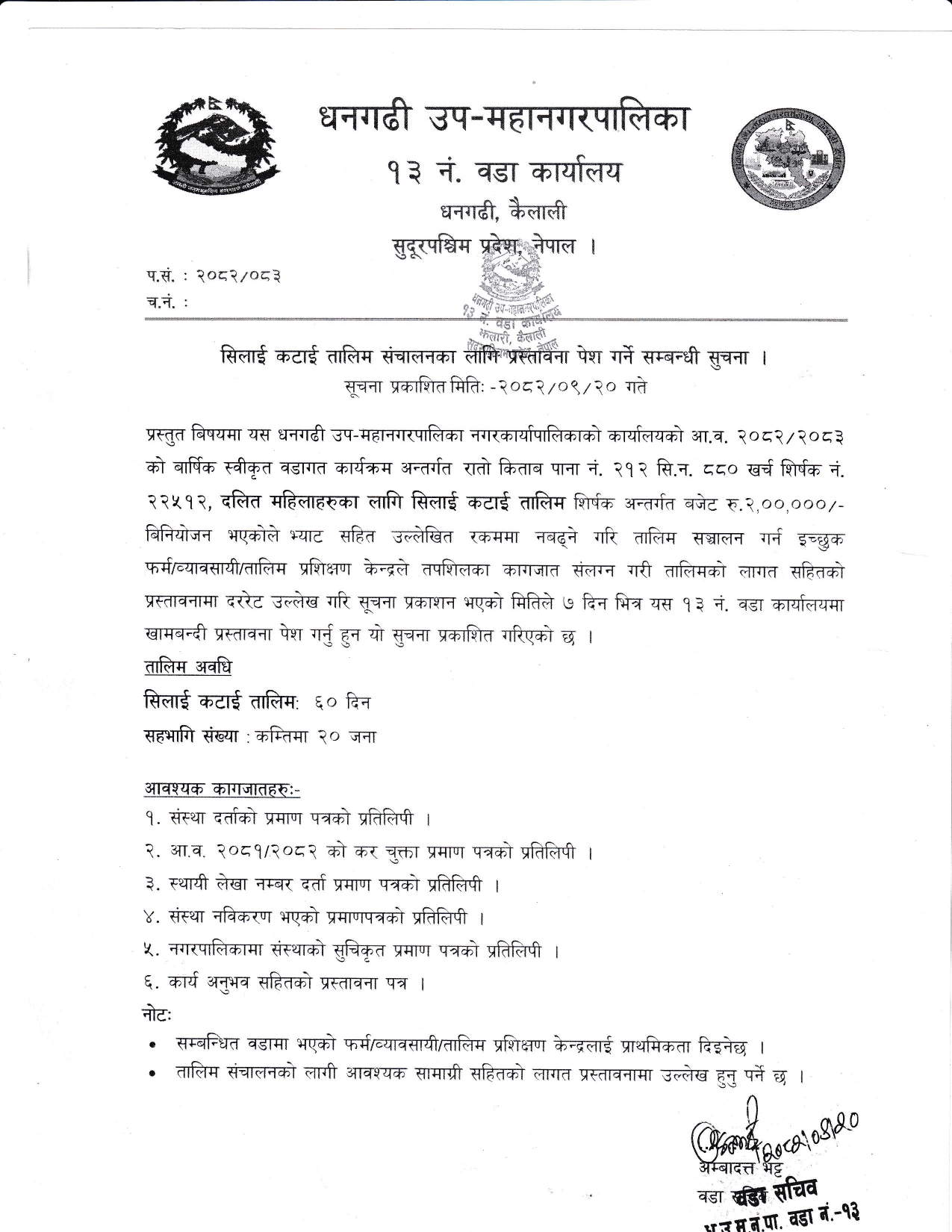 वडा नं १३ को सिलाई कटाई तालिम संचालनका लागि प्रस्तावना पेश गर्ने सम्बन्धी सूचना