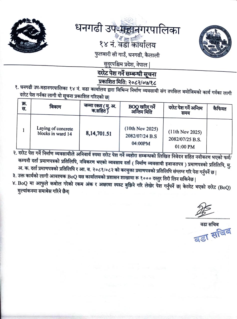 » वडा नं १४ को दररेट पेश गर्ने सम्बन्धी सूचना [Laying of concrete blocks in ward 14]